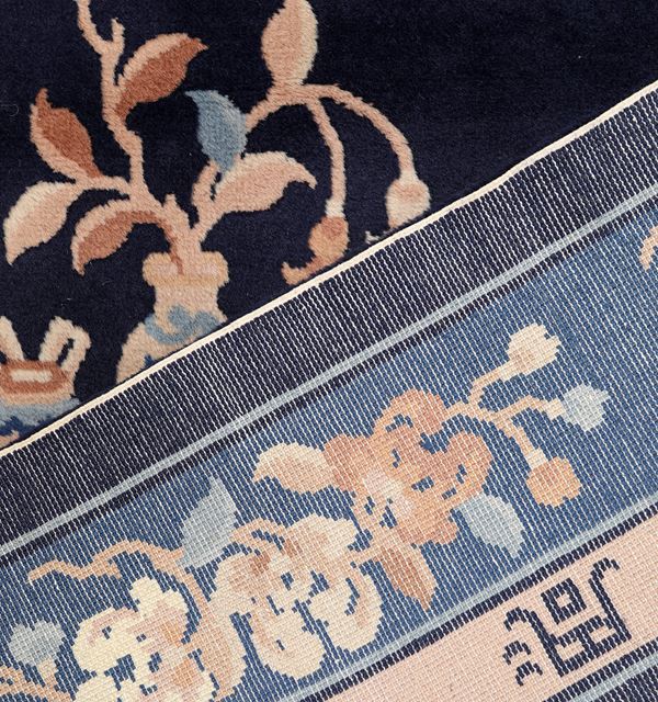 Il design presenta un medaglione centrale con elementi vegetali stilizzati e vasi ornamentali, circondato da angoli decorati con fiori e simboli tradizionali. La cornice è arricchita da motivi floreali e simbolici, tipici dei tappeti Pechino, che riflettono influenze dell’arte classica cinese.