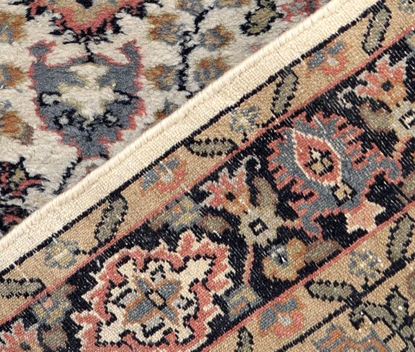Il campo centrale, in avorio, è decorato con un grande medaglione floreale a quattro punte in blu navy e rosa cipria, circondato da una fitta composizione di arabeschi e rami intrecciati che conferiscono al tappeto un’armoniosa sinuosità.