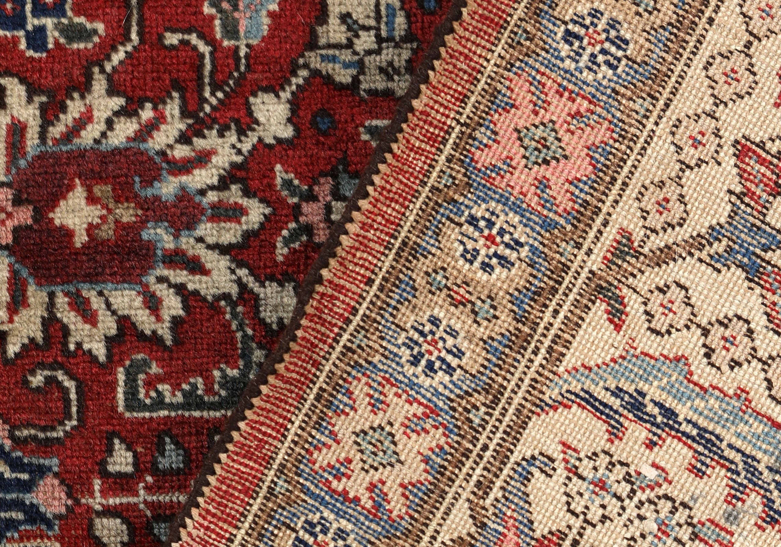 esemplare raffinato della tradizione artigianale persiana, noto per la qualità della lana e per il suo design sontuoso. Il campo centrale, di un intenso rosso carminio, è arricchito da un elaborato schema floreale, in cui grandi vasi decorati con fiori stilizzati si alternano a tralci vegetali intrecciati, creando un effetto di grande armonia ed eleganza.