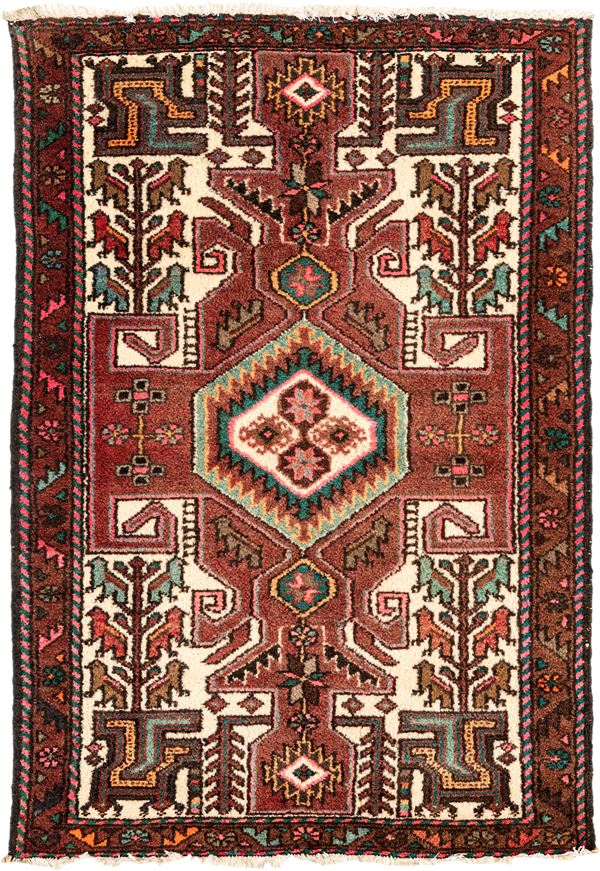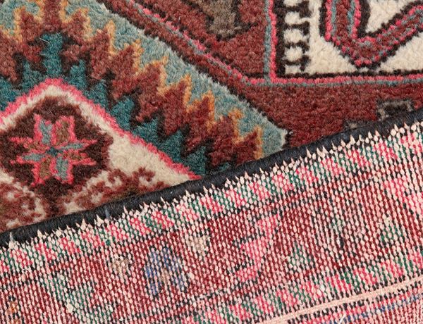 esempio dell’arte tessile tribale della Persia meridionale. Il design è dominato da un medaglione centrale a forma di rombo, decorato con dettagli geometrici e floreali, il tutto incorniciato da un campo ricco di simboli tribali.
