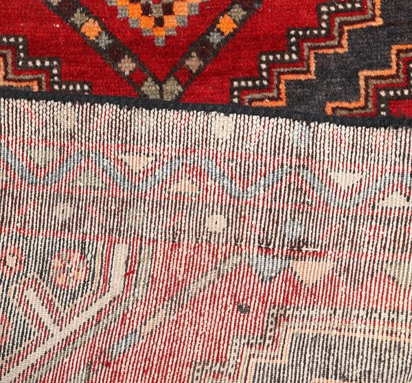 caratterizzato da un design geometrico audace e fortemente simmetrico. Il campo rosso intenso è decorato con tre grandi medaglioni romboidali, composti da piccoli motivi a scacchiera, circondati da elaborati contorni a zig-zag in nero, arancione e avorio. Gli angoli del tappeto presentano dettagli decorativi stilizzati che arricchiscono ulteriormente la composizione.
