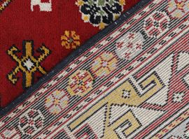 Il campo centrale, di un rosso acceso, è decorato con tre grandi medaglioni romboidali intricati, arricchiti da dettagli geometrici e floreali. Il tappeto è incorniciato da una serie di bordi complessi, caratterizzati da motivi stilizzati e influenze etniche tipiche della regione. Il contrasto cromatico tra il rosso, il verde e il giallo dona al tappeto un aspetto vibrante e armonioso.