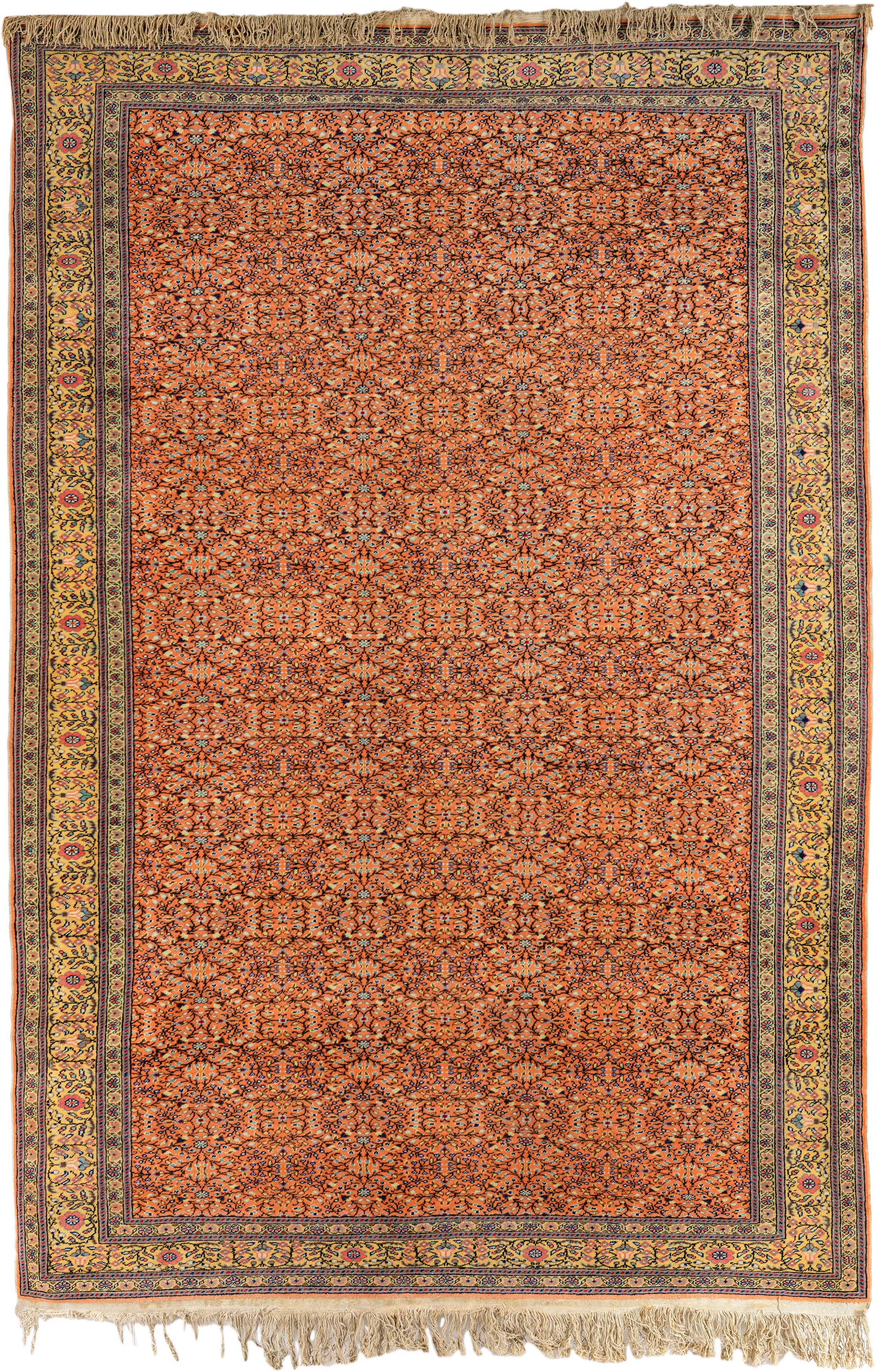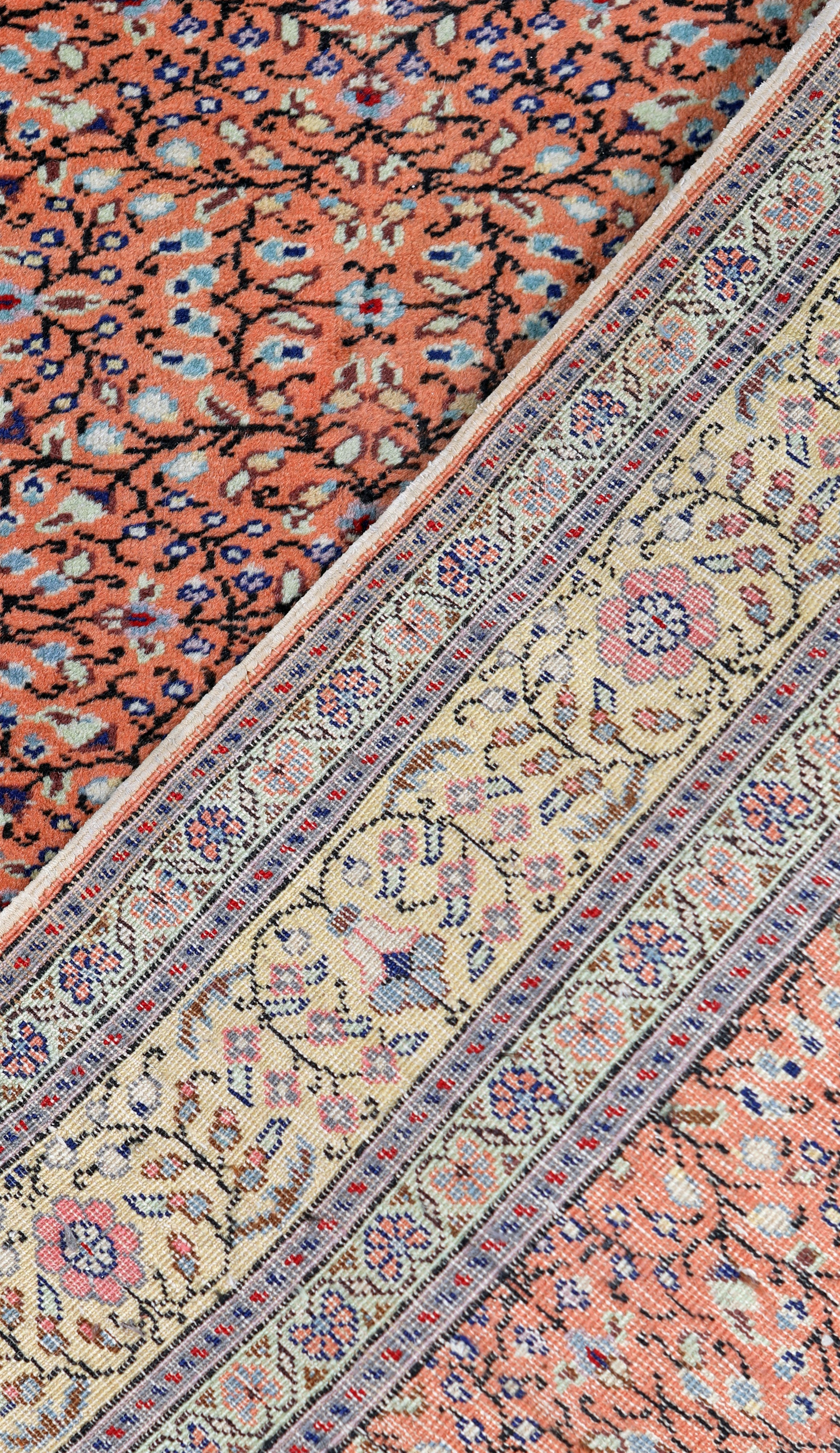 caratterizzato da un raffinato motivo Mahi (Herati) su un fondo arancio delicato. Questo motivo, composto da una ripetizione di elementi floreali stilizzati e ricchi dettagli intrecciati, crea una straordinaria armonia visiva. Il tappeto è incorniciato da eleganti bordure floreali su fondo avorio e giallo dorato, che aggiungono un contrasto raffinato ed equilibrato.