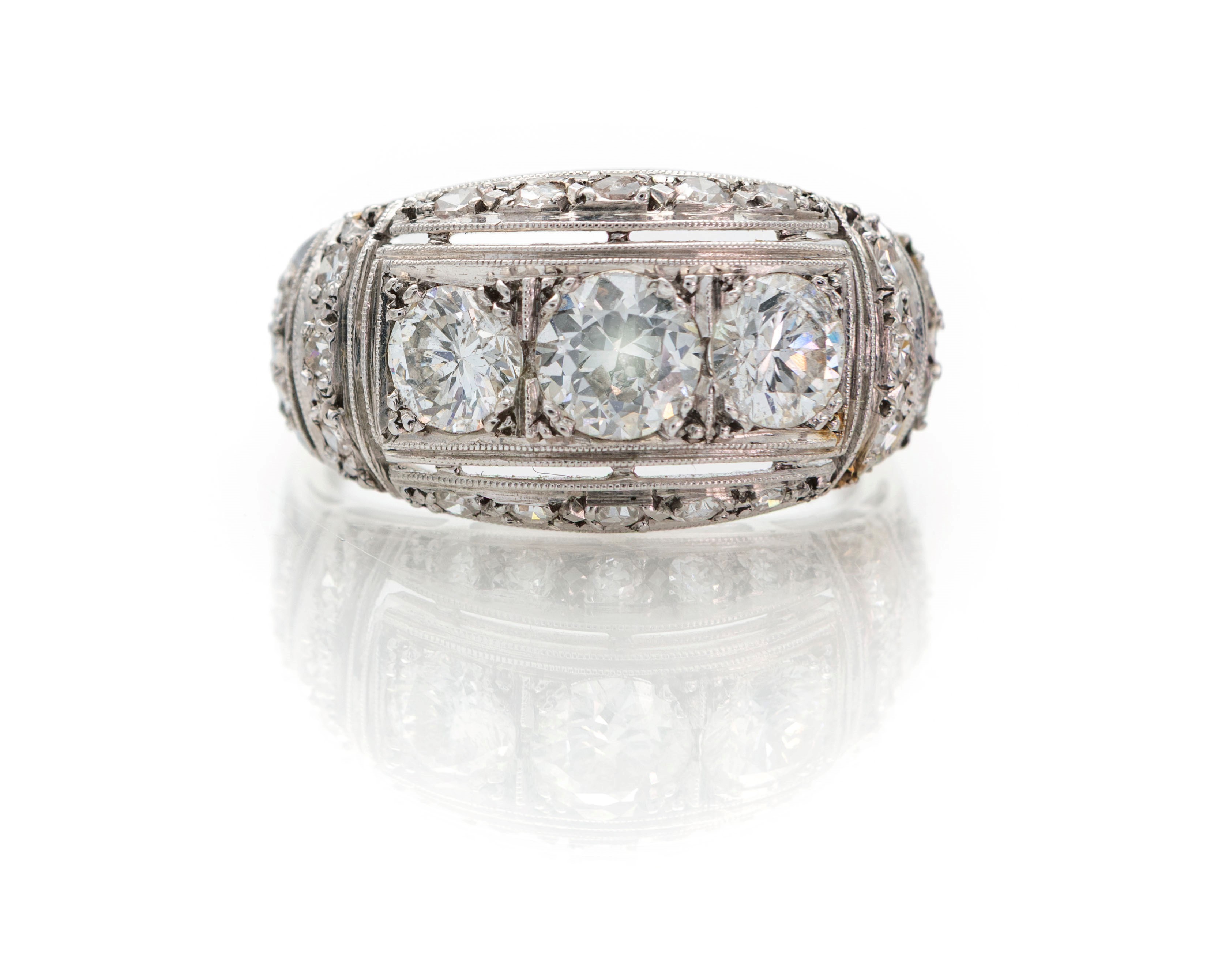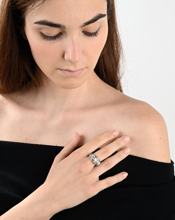 Oro bianco 750/000. Tre diamanti centrali ct. 1,10 circa più brillanti 0,30 circa. Peso complessivo gr. 4,80