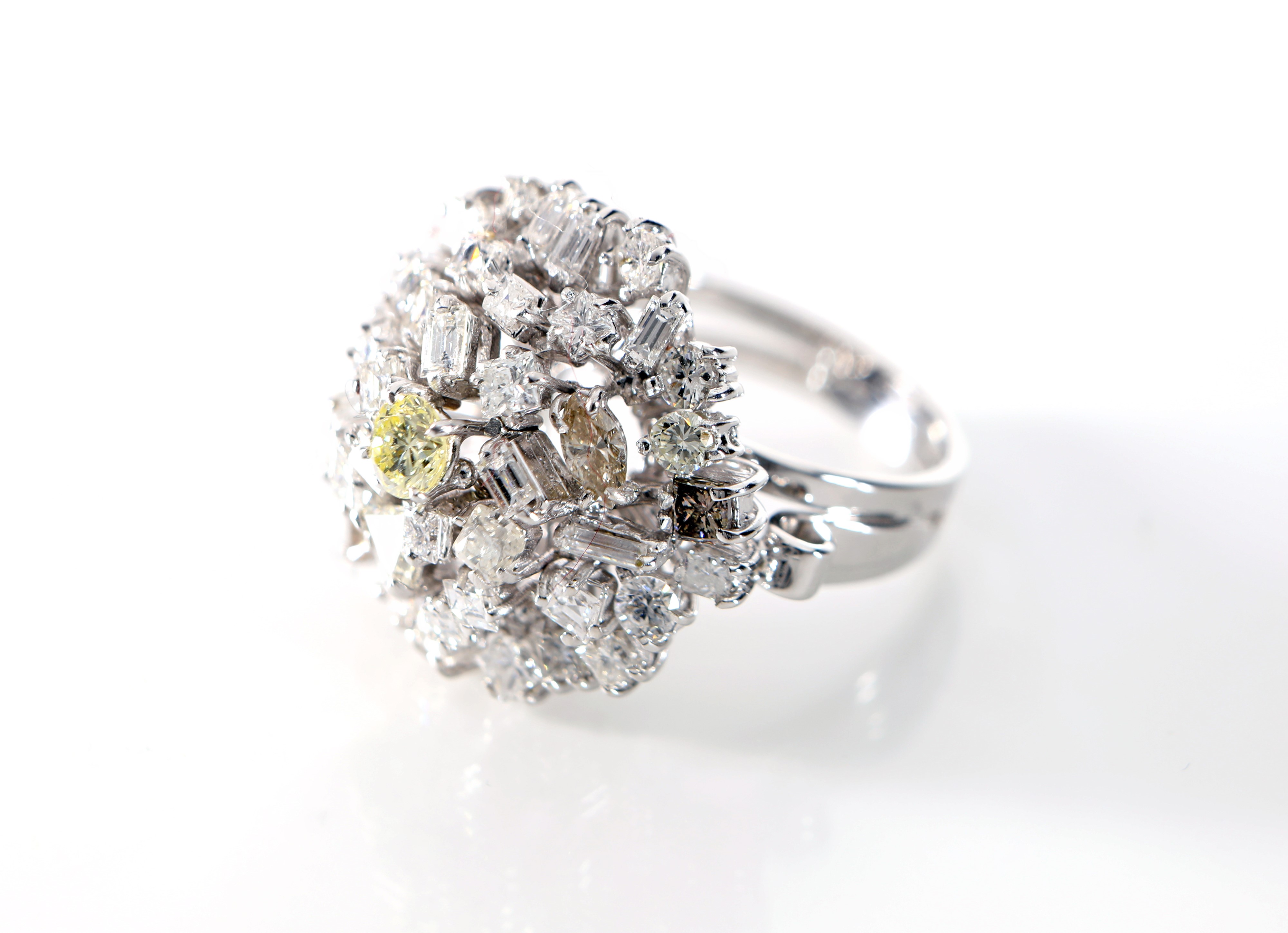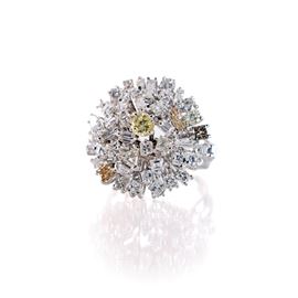 Oro bianco 750/000. Diamanti in taglio rotondo brillante, triangoli, carrè, baguettes, incolori e fancy color per complessivi ct. 2,40 ca. Peso complessivo gr. 10,60.