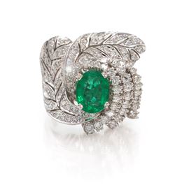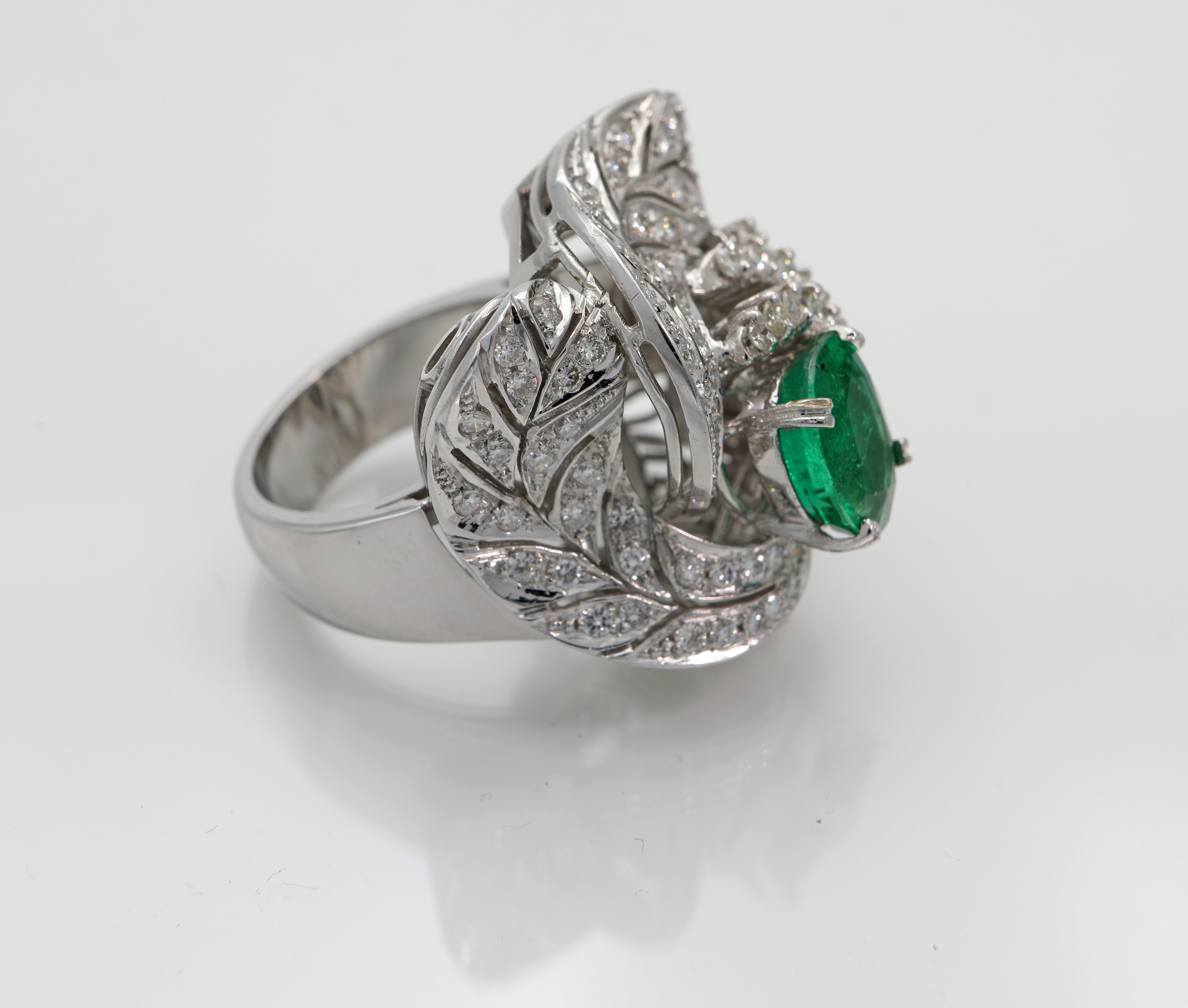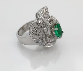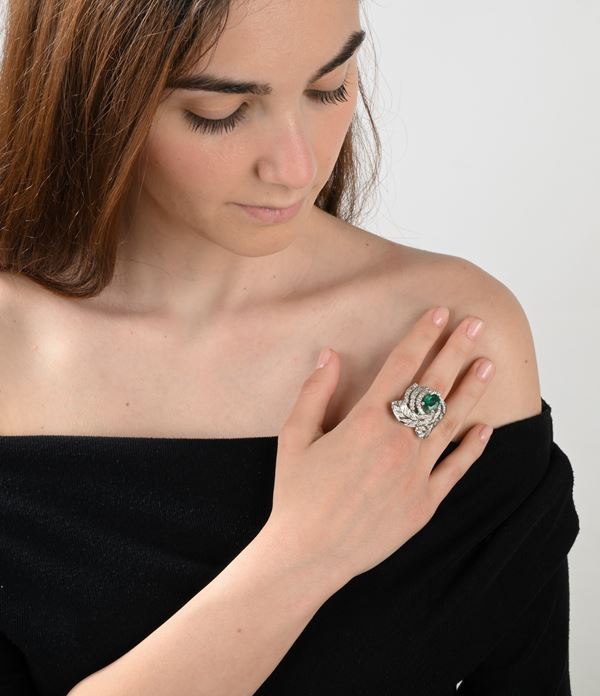 Oro bianco 750/000. Smeraldo in taglio ovale ct. 3,50 ca. Diamanti in taglio rotondo brillante ct. 2,60 ca. Peso complessivo gr. 23,80