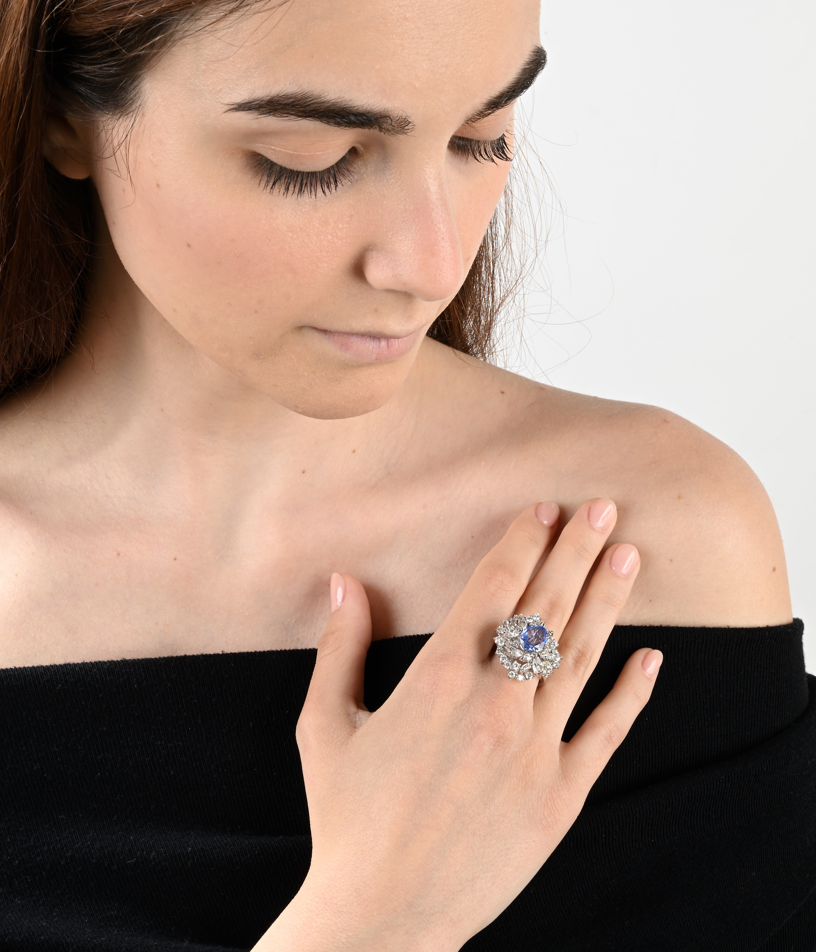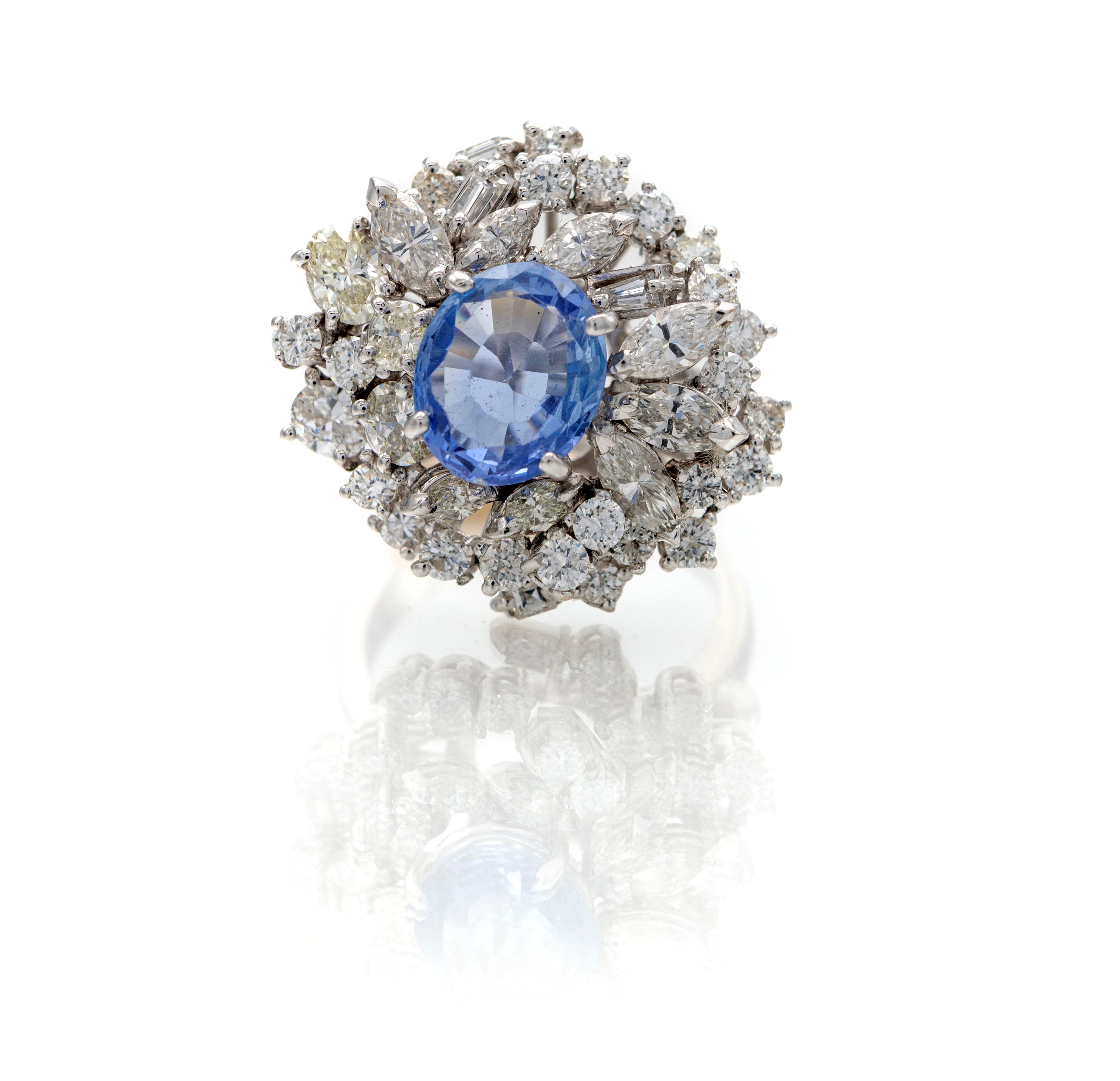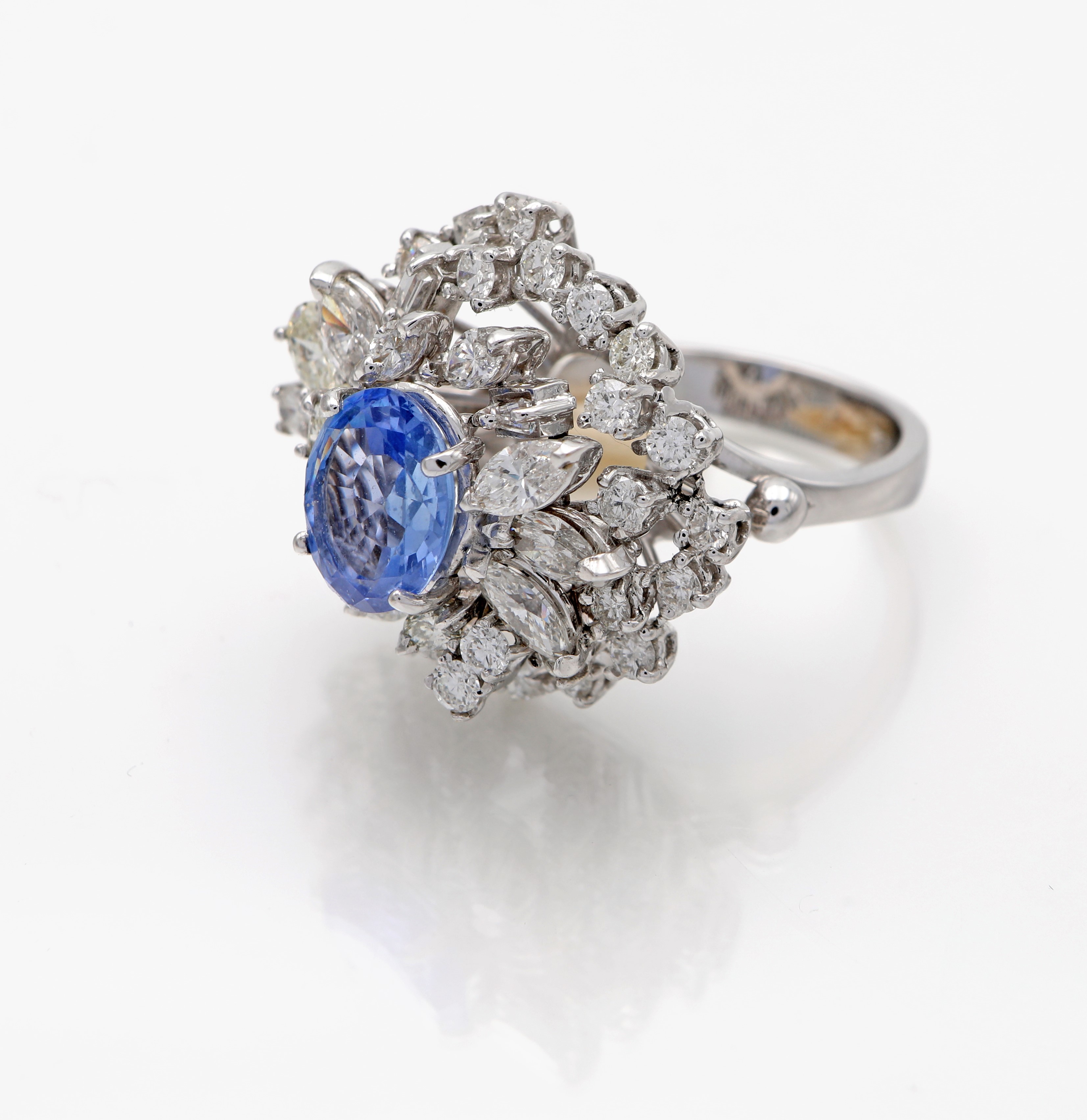 Oro bianco 750/000. Zaffiro in taglio ovale ct. 3,90. Diamanti in taglio rotondo, navette, ovale e tepper brillante ct. 3,80 ca. Peso complessivo gr. 12