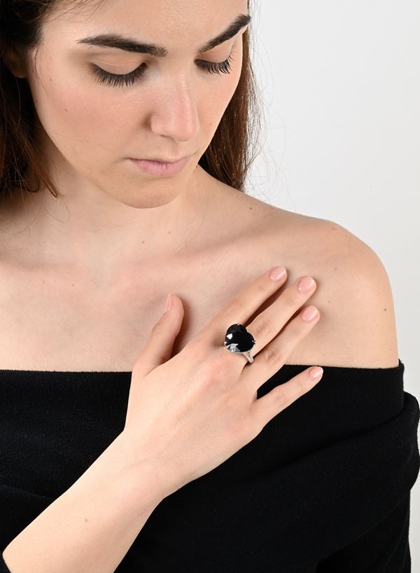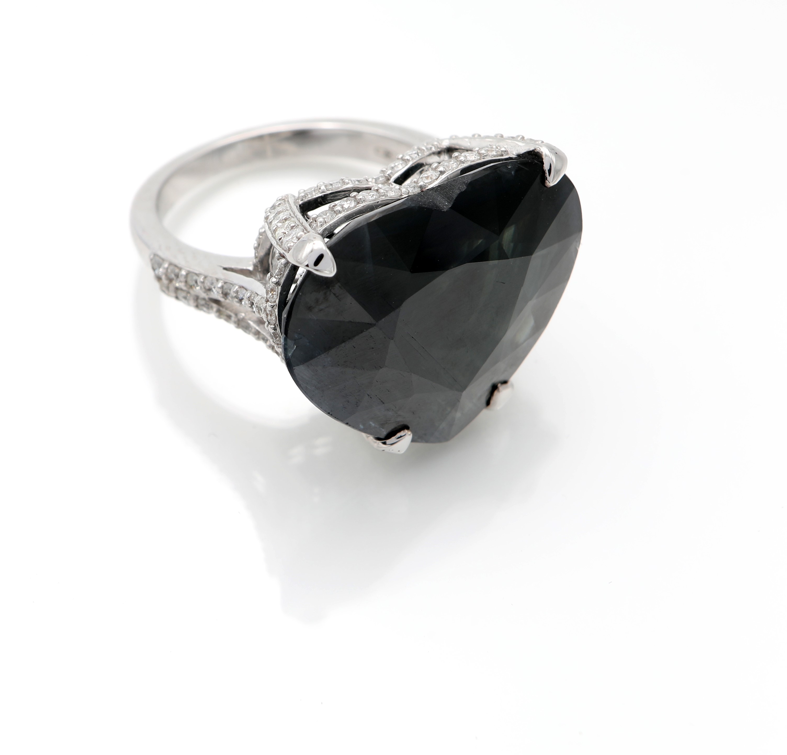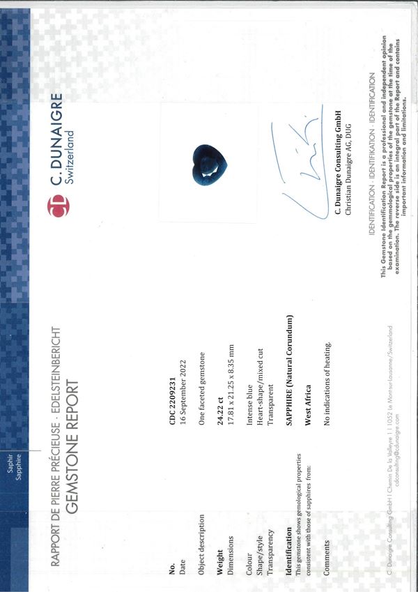 Oro bianco 750/000. Zaffiro centrale in taglio cuore, ct. 24,22, West Africa, SENZA INDICAZIONE DI TRATTAMENTO TERMICO, diamanti in taglio rotondo brillante. Peso complessivo gr. 11,60. Corredato di certificazione gemmologica, Dunaigre, n° CDC 2209231 del 16/09/2022.