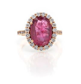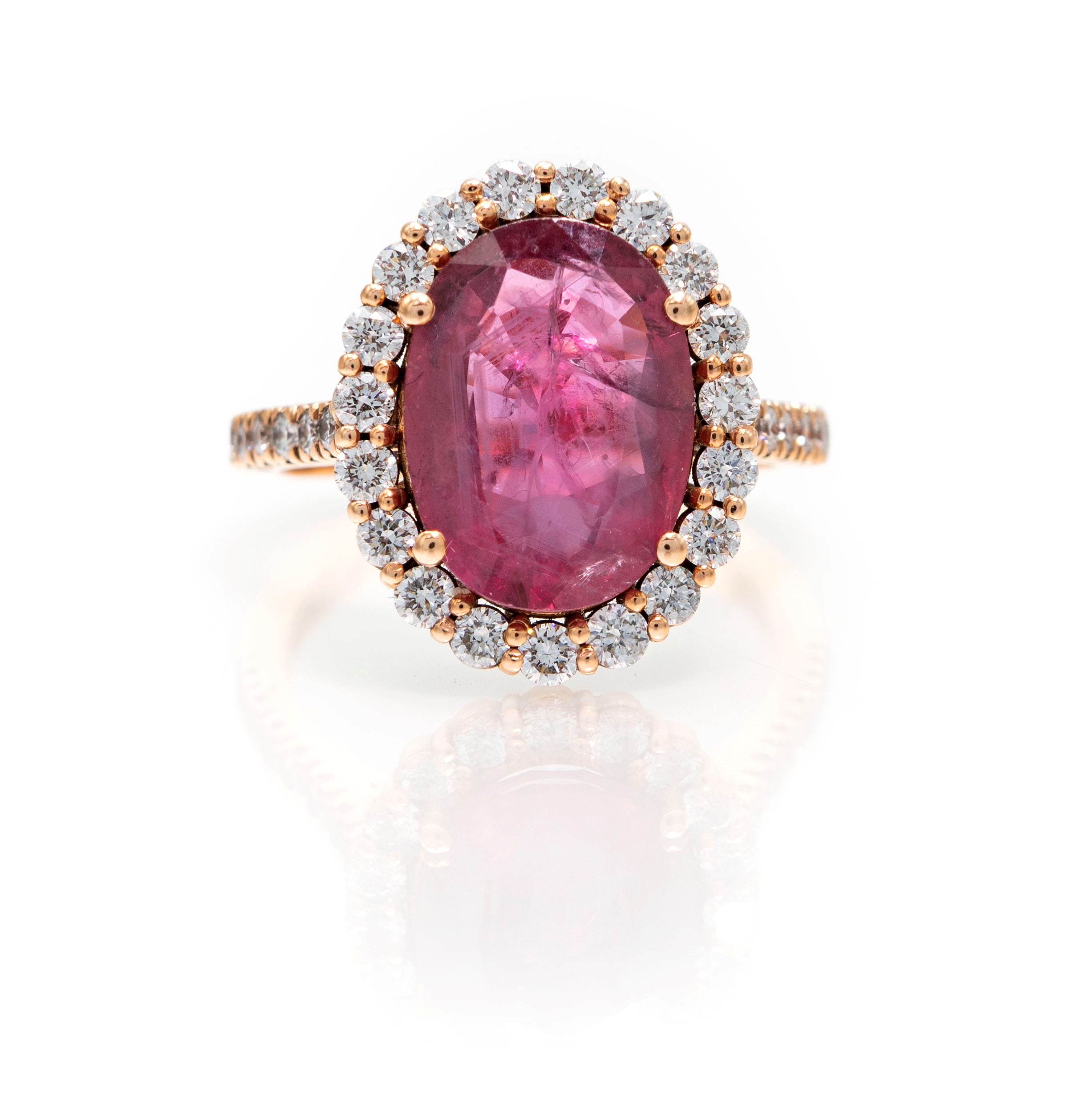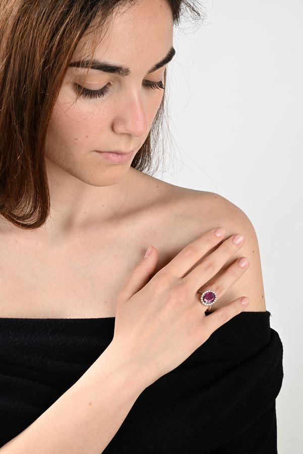 Oro rosa 750/000. Rubino in taglio ovale ct. 4,5 ca. Diamanti in taglio rotondo brillante ct. 0,70