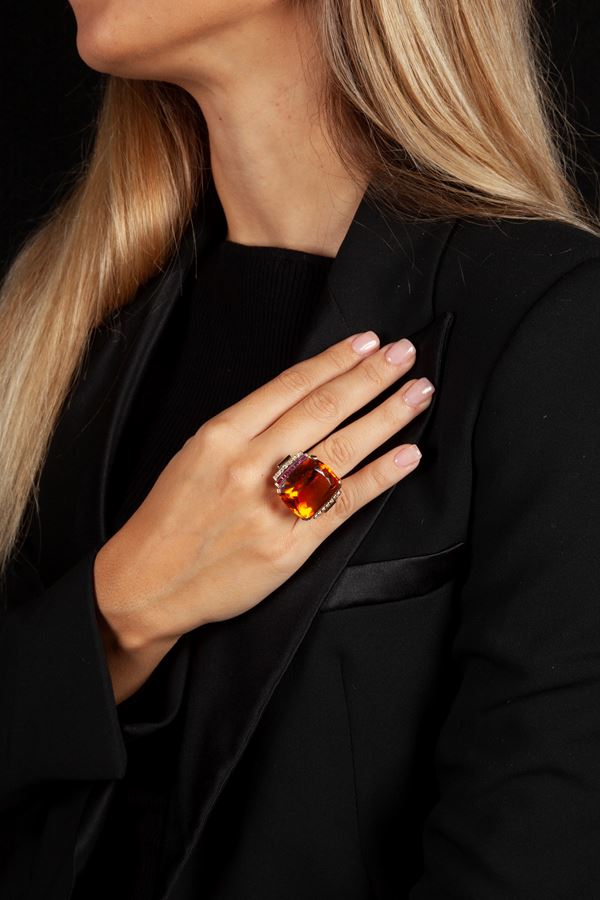 Anello in oro rosa, quarzo citrino, diamanti e rubini, Art Retrò