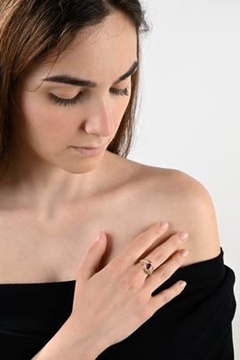 Oro giallo 750/000. Rubino in taglio ovale ct. 1 ca, diamanti in taglio rotondo brillante ed a gradini. Peso complessivo gr. 6,10.