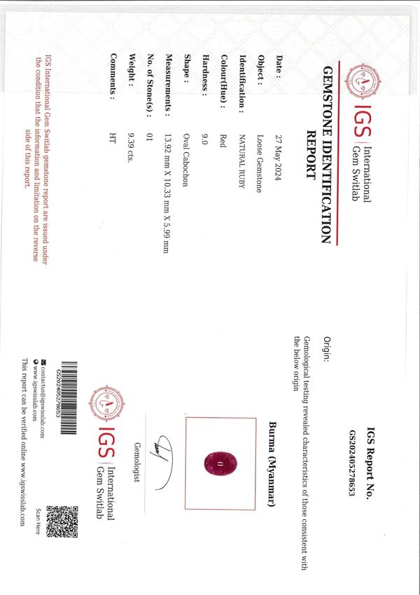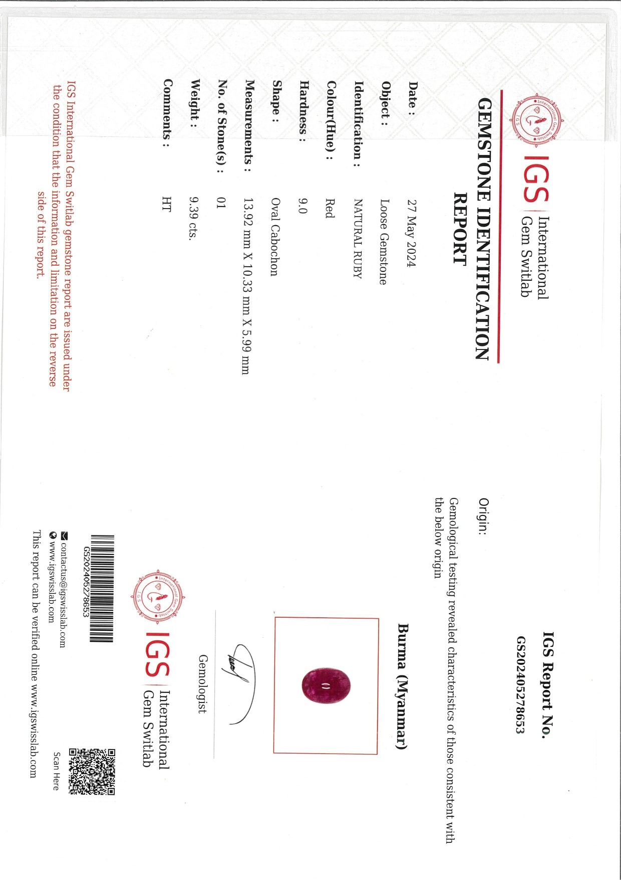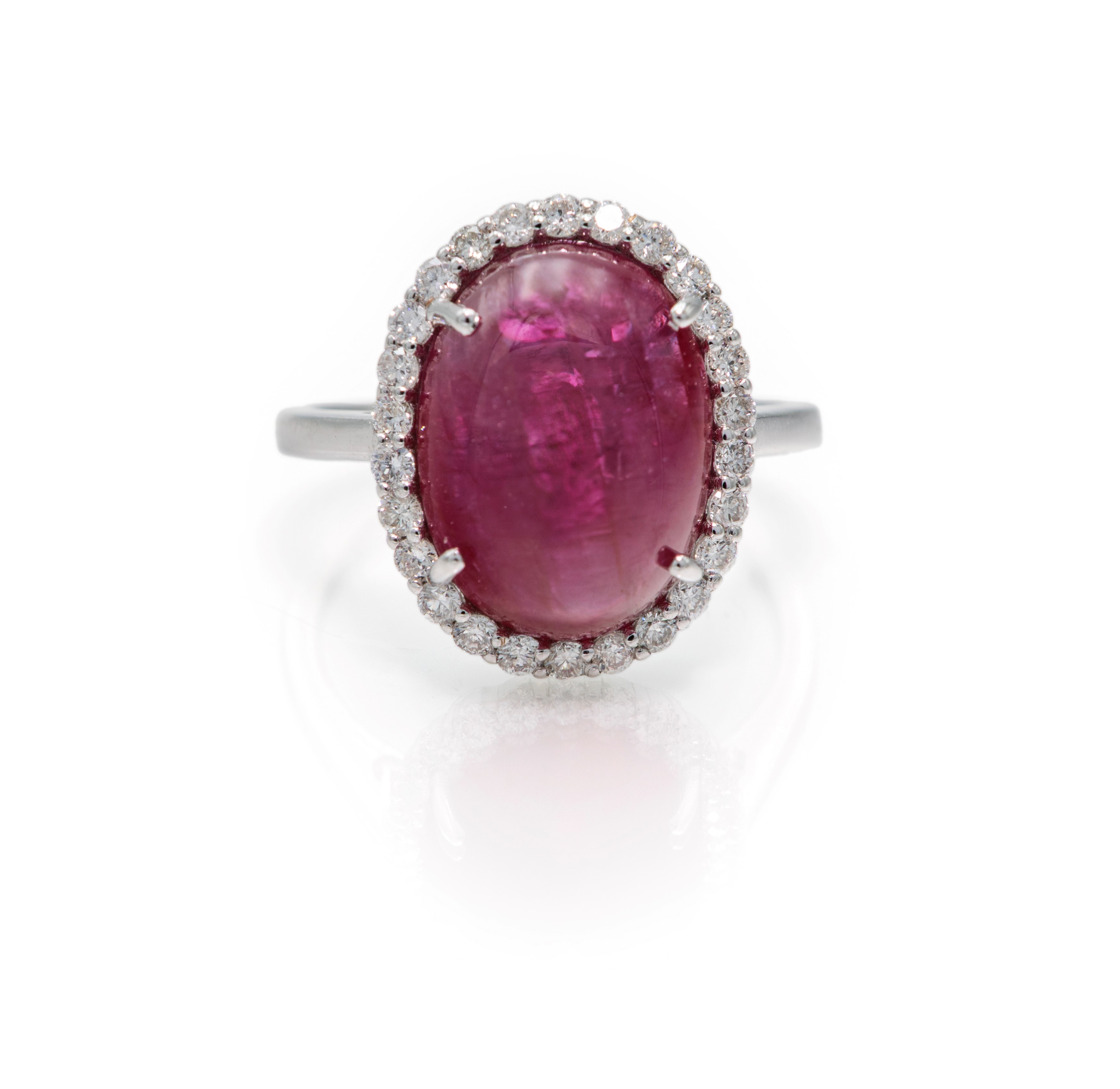 Oro bianco 750/000. Rubino in taglio cabochon ct. 9,39, BURMA - MYANMAR. Diamanti in taglio rotondo brillante. Peso complessivo gr. 6,20. Corredato di certificazione gemmologica IGS, Svizzera, n° GS202405278653 del 27/05/2024.