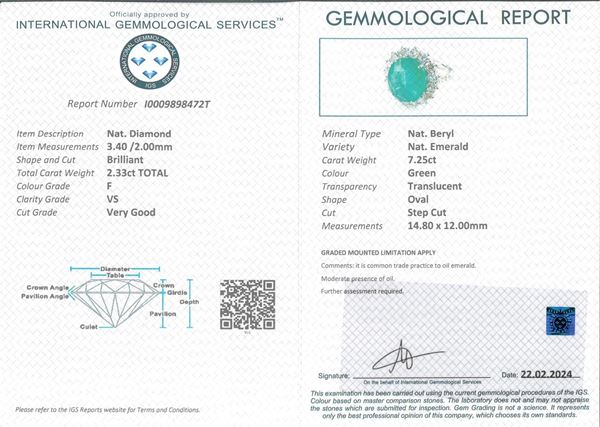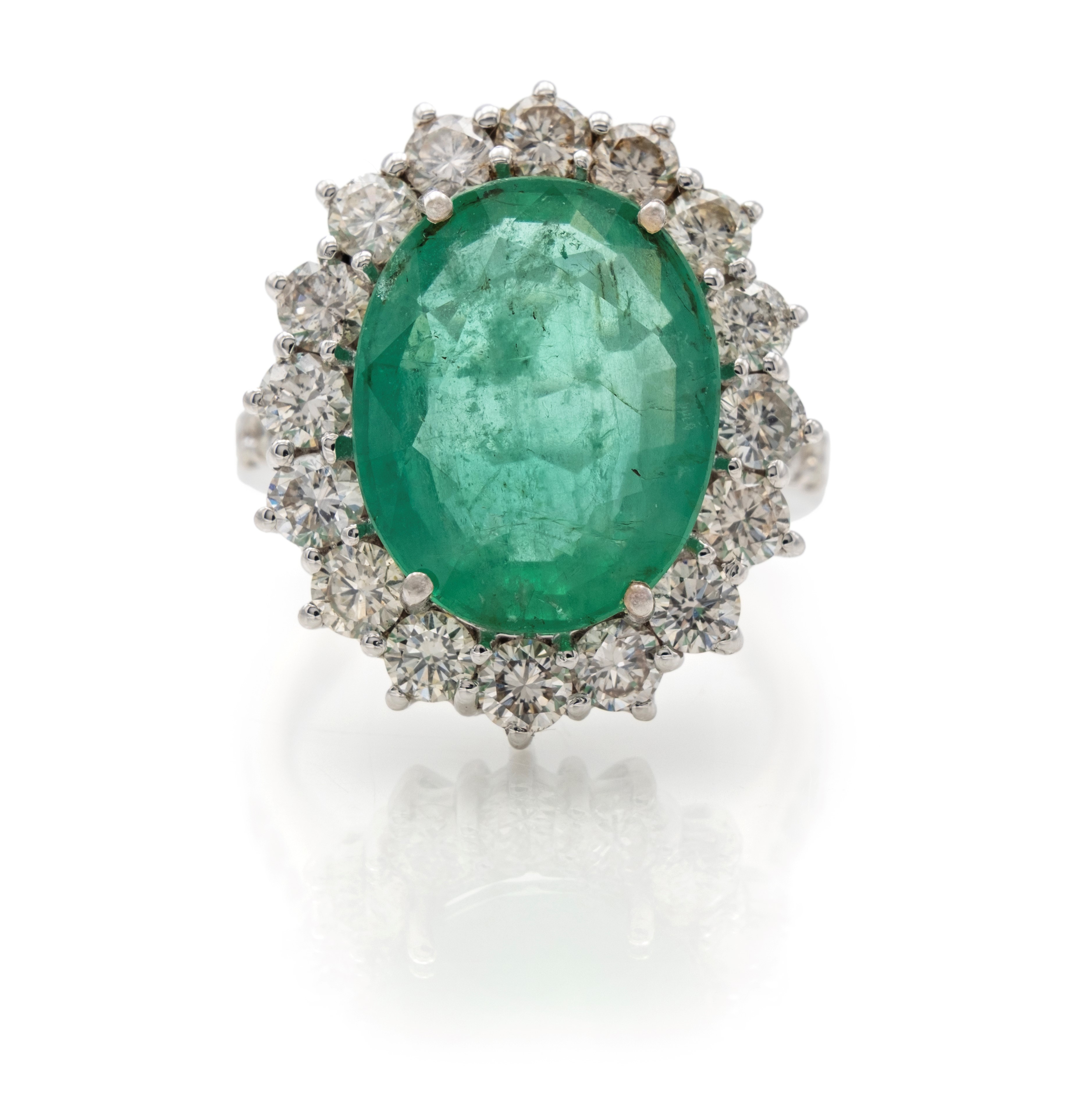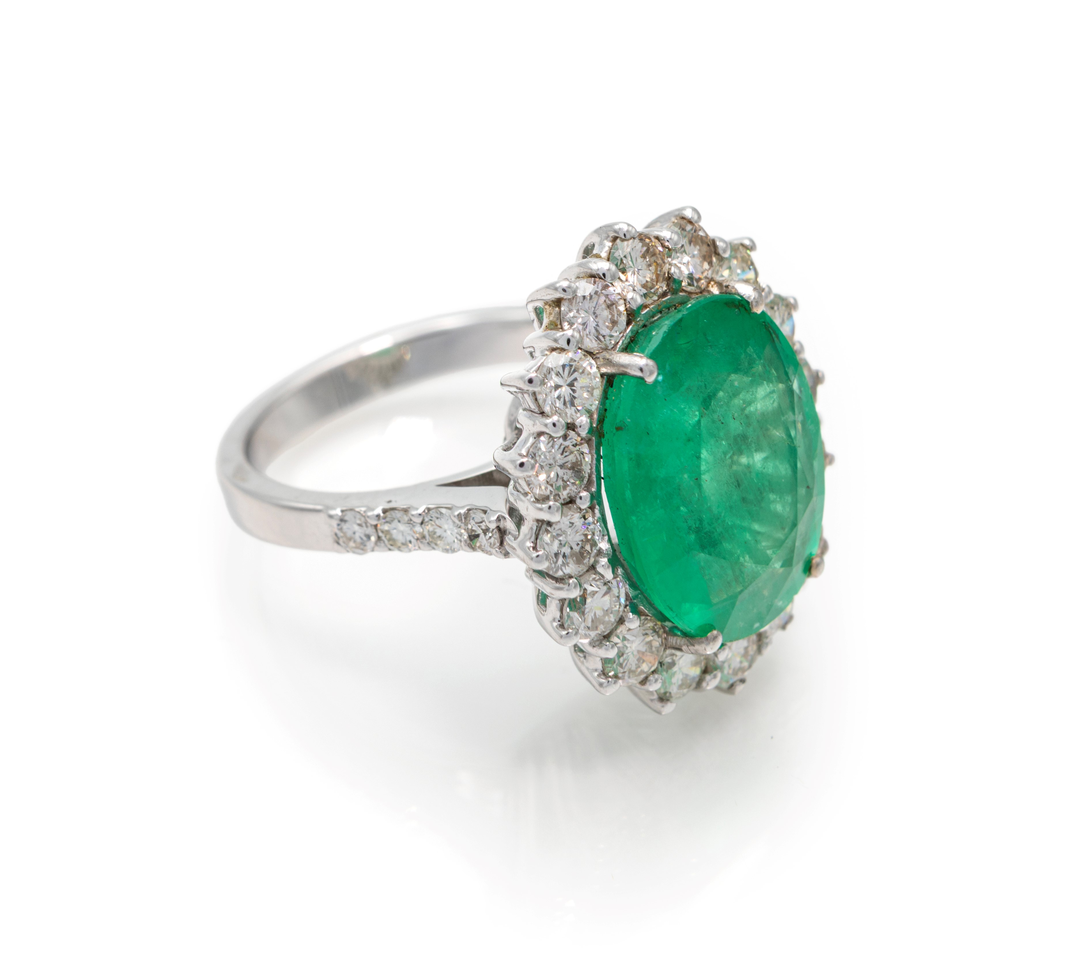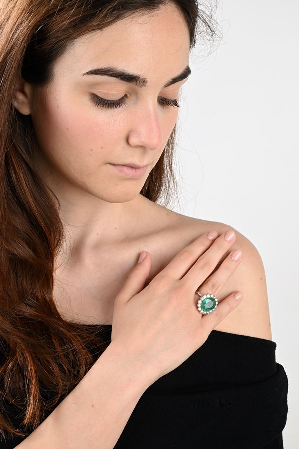 Oro bianco 750/000. Smeraldo in taglio ovale ct. 7,25. Diamanti in taglio rotondo brillante ct. 2,33 , F, VS. Peso complessivo gr. 10,40. Corredato di certificazione originale