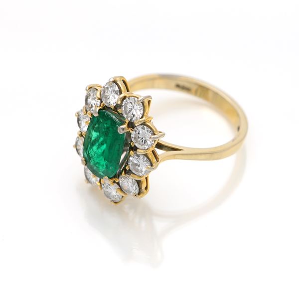 Oro giallo 750/000. Smeraldo naturale in taglio ovale ct. 3 ca, diamanti in taglio rotondo brillante ct. 1,30 ca. Peso complessivo gr. 5,20