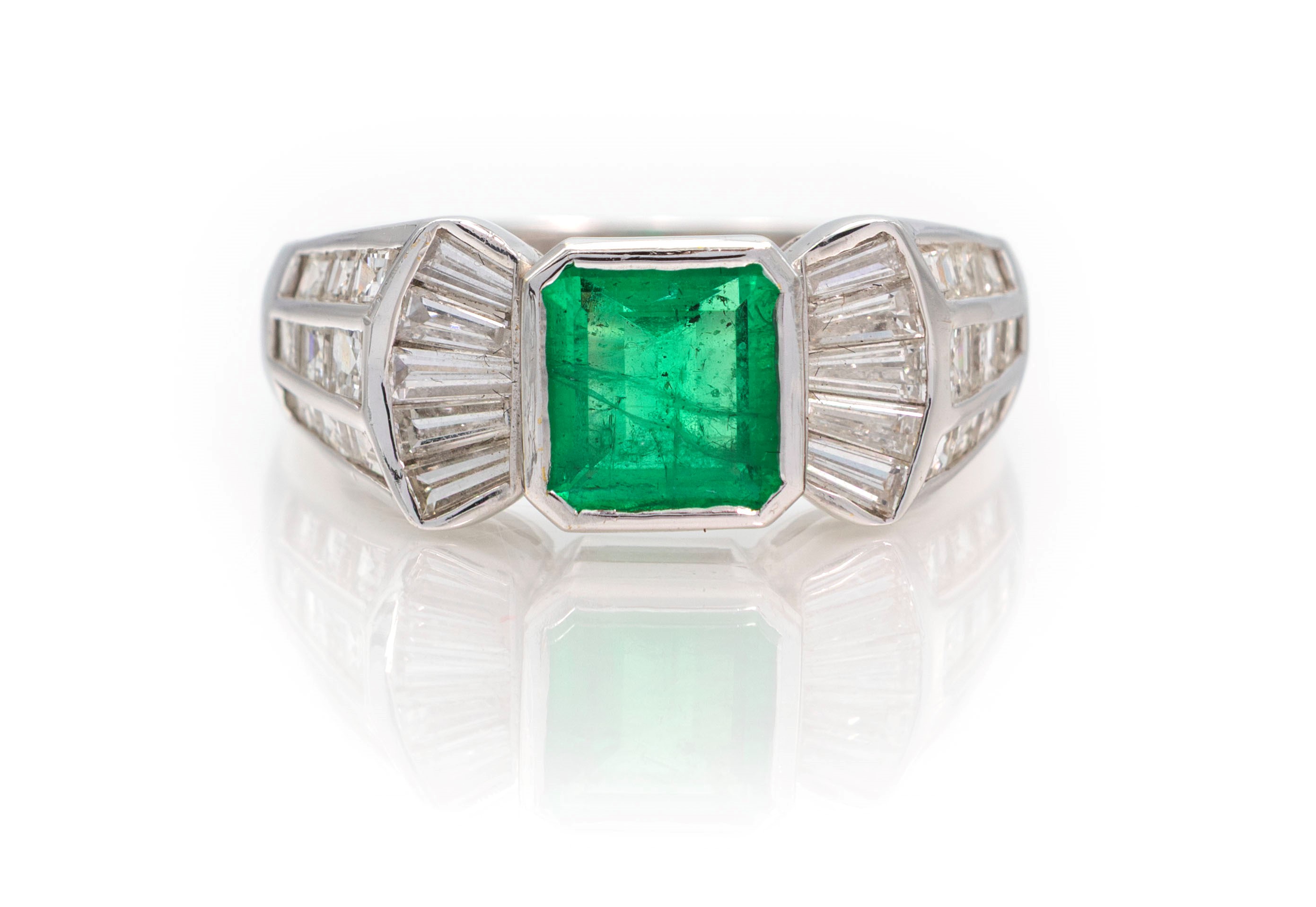 Oro bianco 750/000. Smeraldo naturale in taglio smeraldo ct 1,20 ca, diamanti in taglio carrè e teps ct. 1,30 ca.
