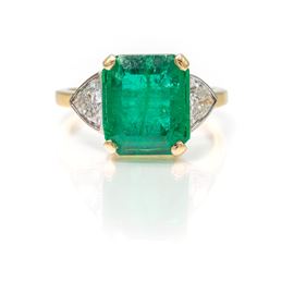 Oro giallo e bianco 750/000. Smeraldo naturale in taglio smeraldo ct. 4,50 ca., diamanti in taglio triangolo ct. 1,20 ca. Peso complessivo gr. 5,70