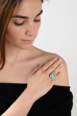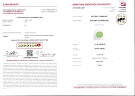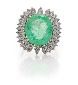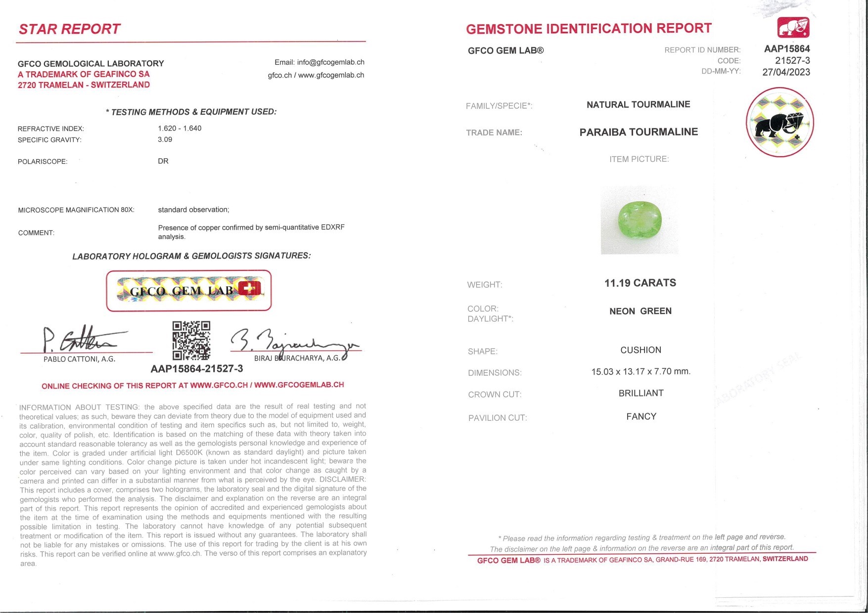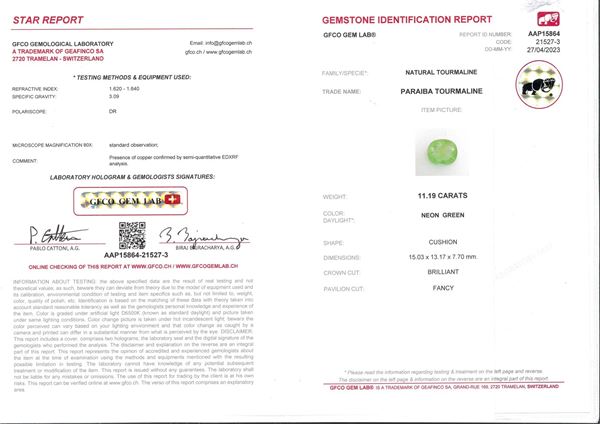 Oro bianco 750/000. Tormalina Paraiba neon green in taglio ct. 11,19, diamanti in taglio rotondo brillante ct. 1,40. ca. Peso complessivo gr. 9,20. Corredato di certificazione gemmologica GFCO, Svizzera, n°AAP15864 del 27/04/2023.