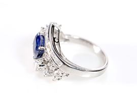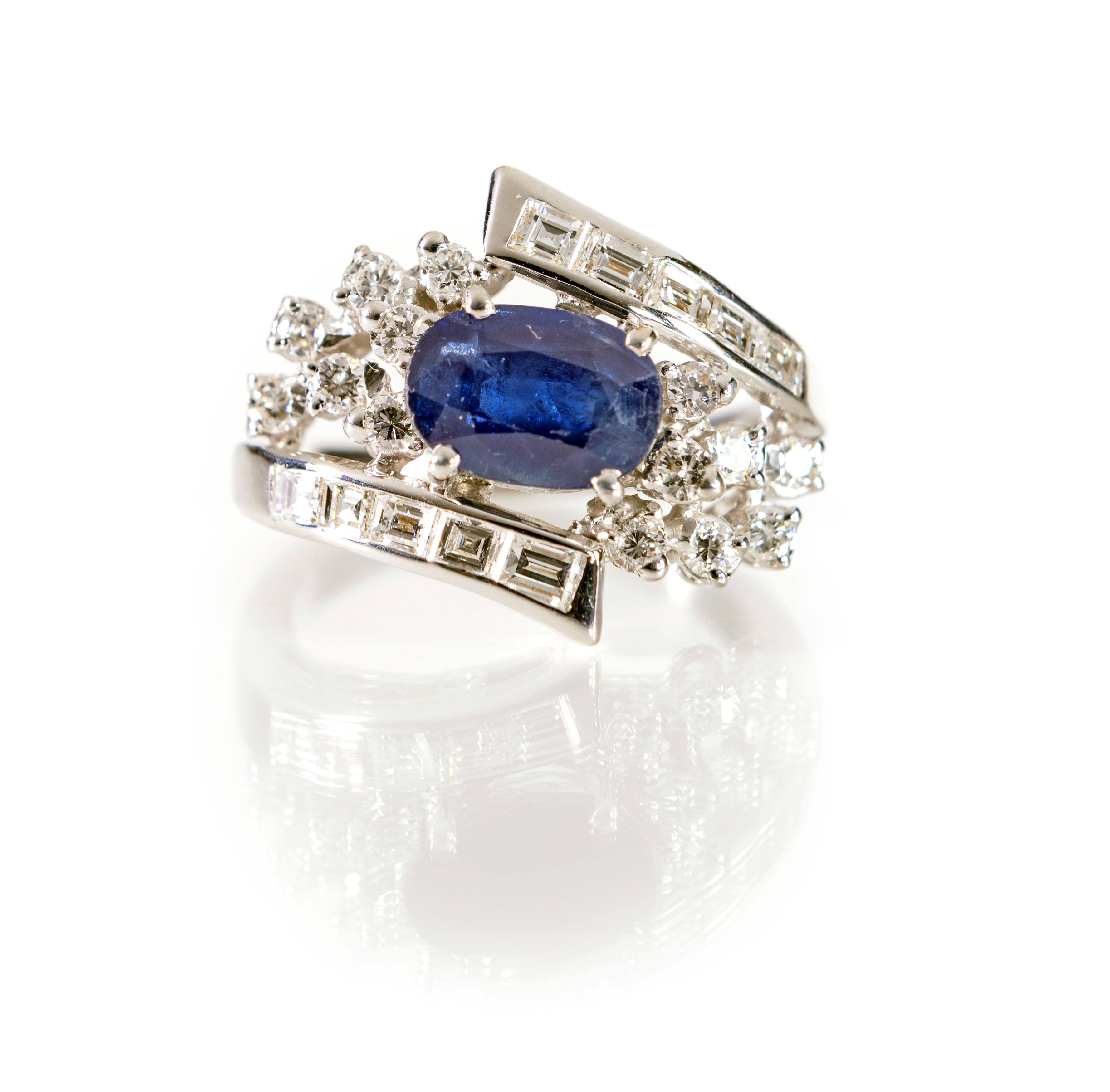 Oro bianco 750/000. Zaffiro in taglio ovale ct. 1,80 ca, diamanti in taglio rotondo brillante e baguettes. Peso complessivo gr. 7,20.