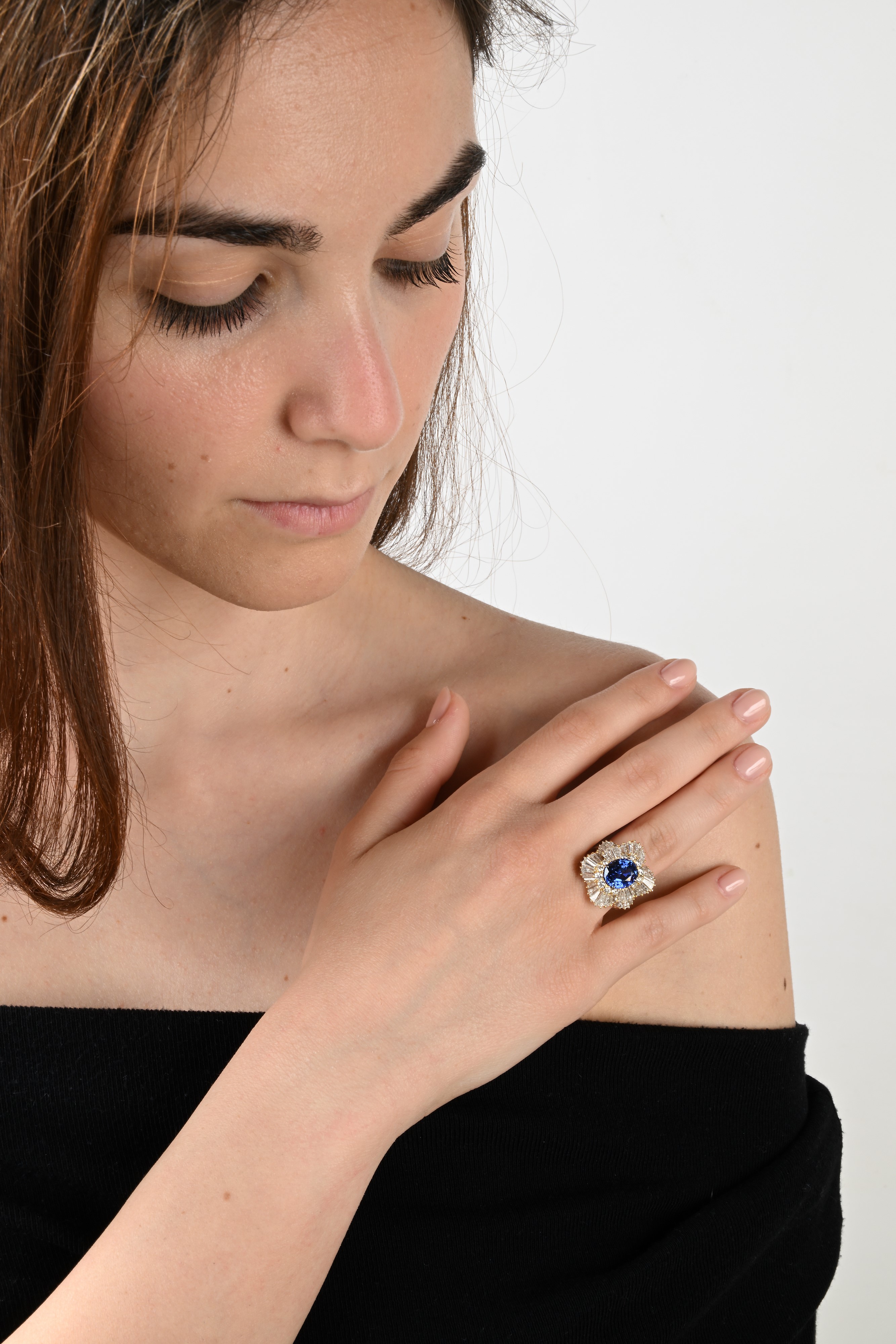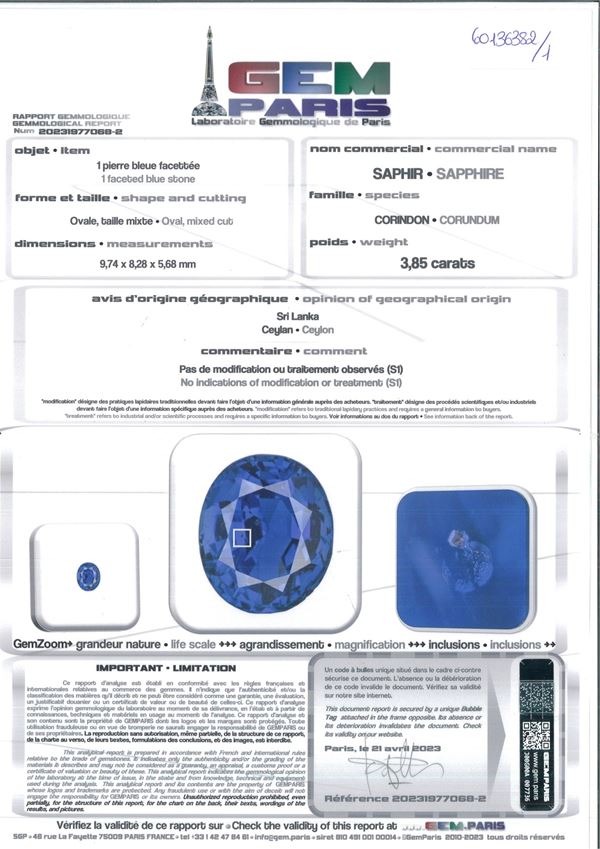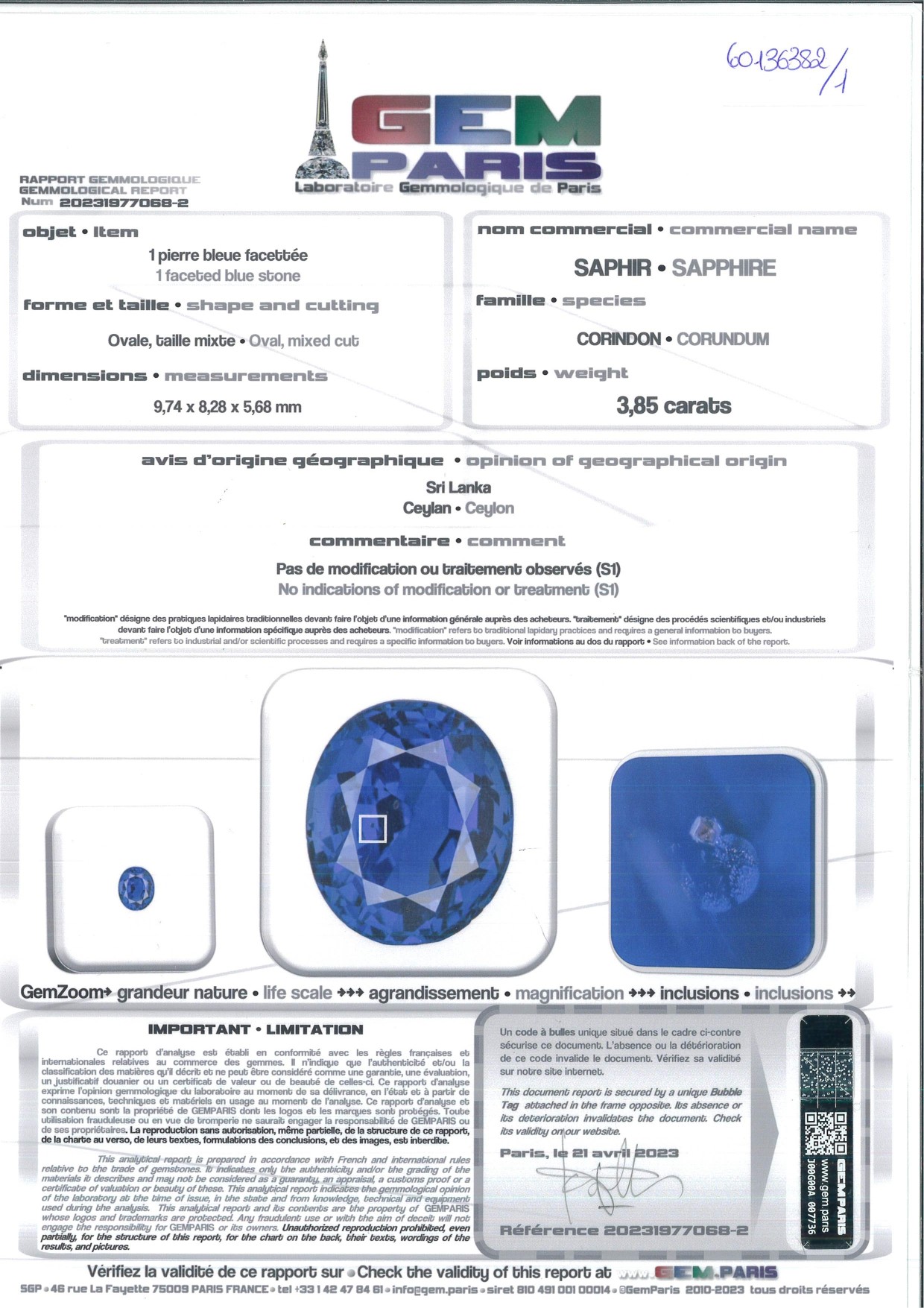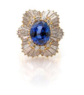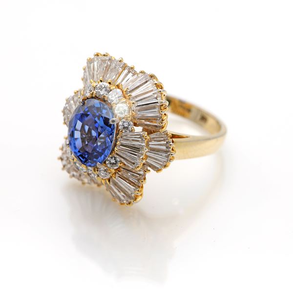Oro giallo 750/000. Diamanti in taglio tepper ct. 2,20, zaffiro in taglio ovale CEYLON - SRI LANKA , SENZA INDICAZIONE DI TRATTAMENTO TERMICO, ct. 3,85. Corredato di certificazione gemmologica GEM Paris n° 20231977068-2. Peso complessivo gr. 8,70