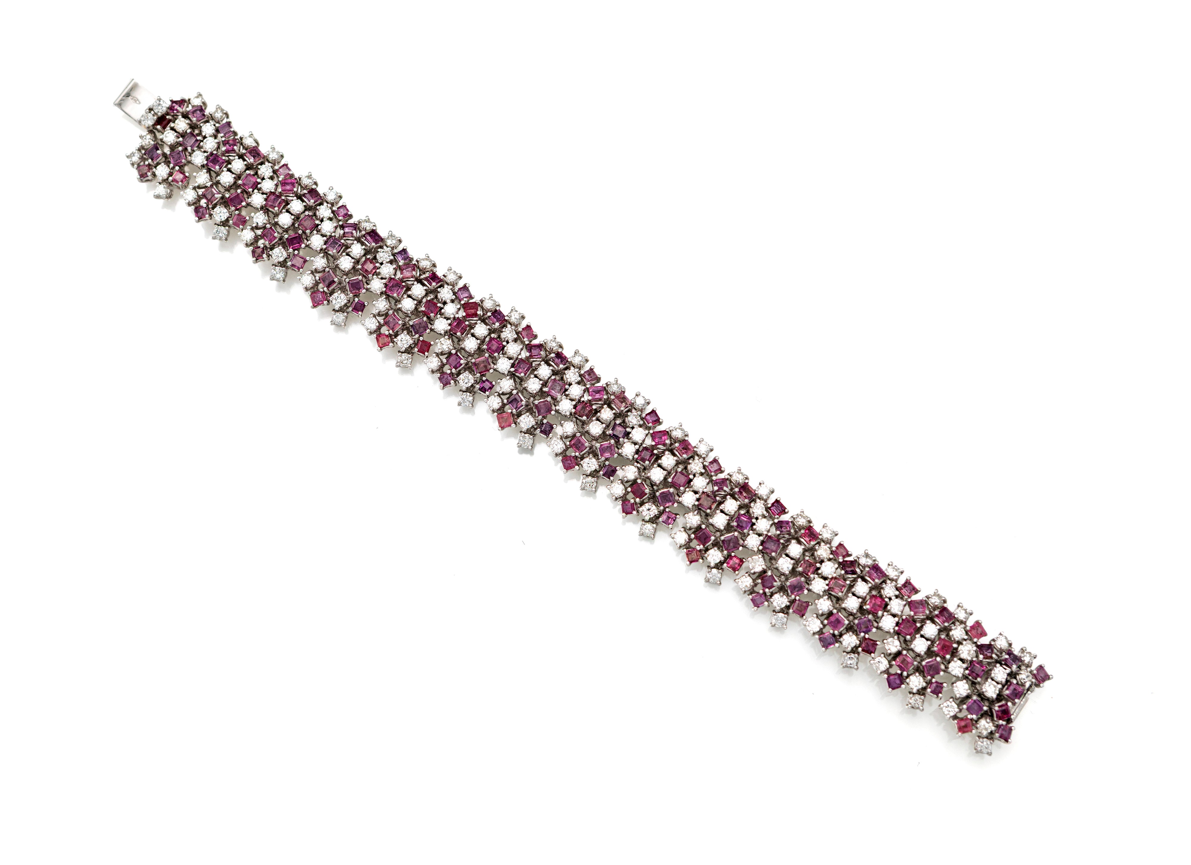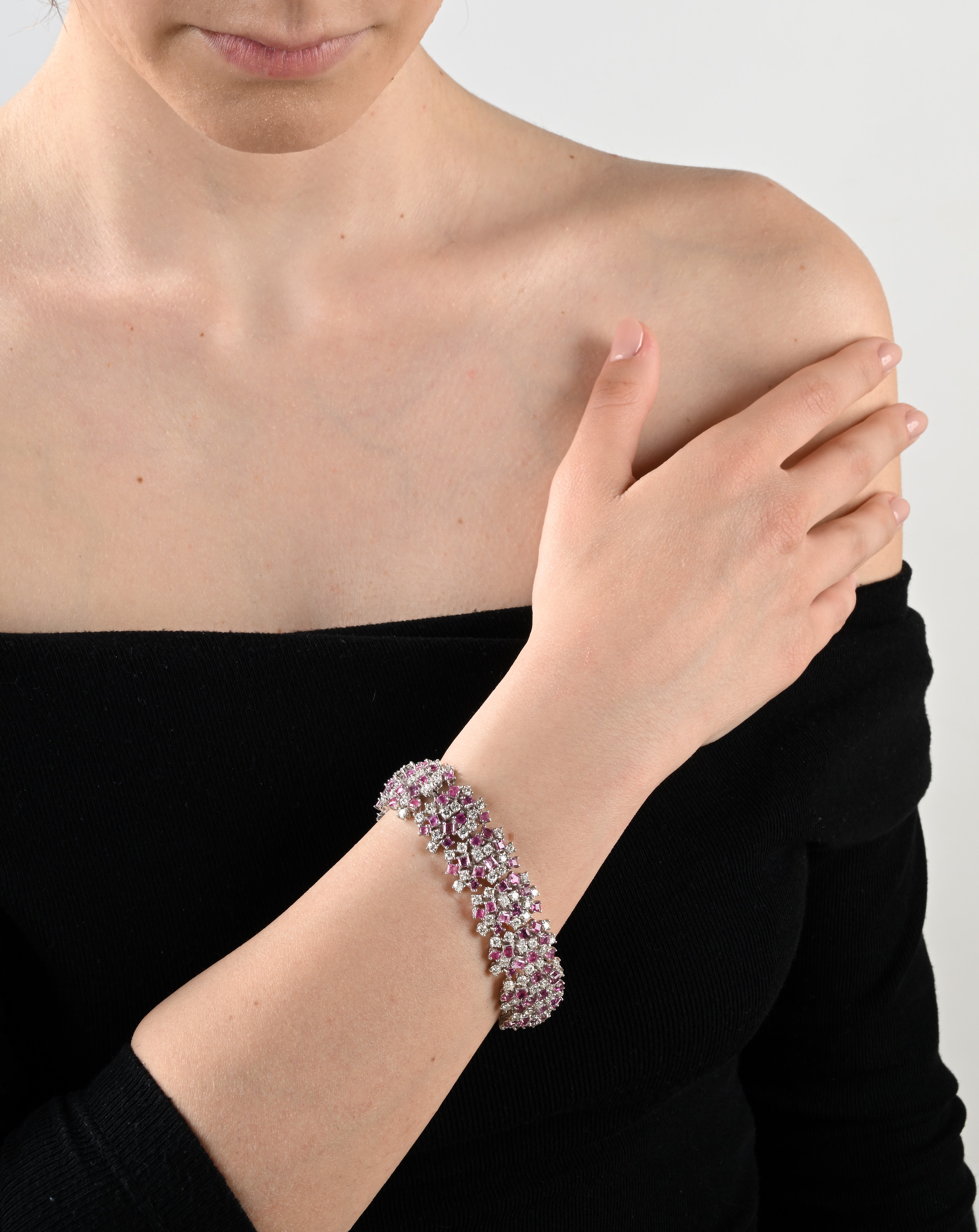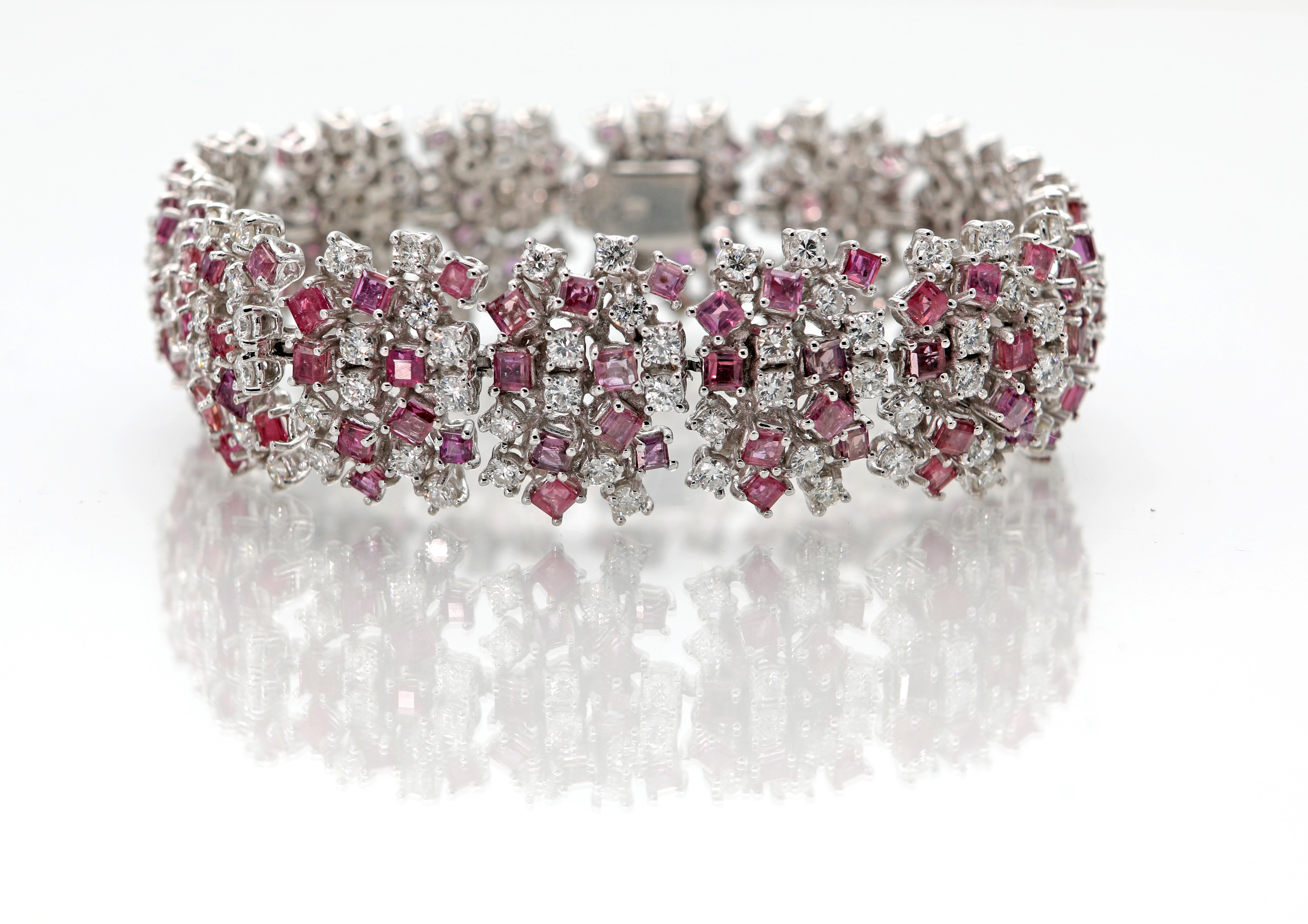 Oro bianco 750/000. Zaffiri naturali rosa in taglio carrè ct. 18. Diamanti in taglio rotondo brillante ct. 8 ca. Peso complessivo gr. 51,70