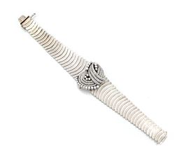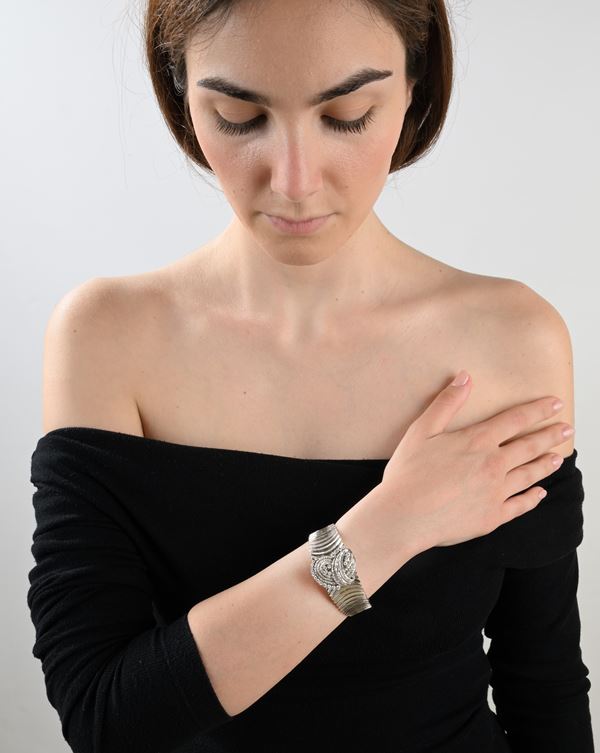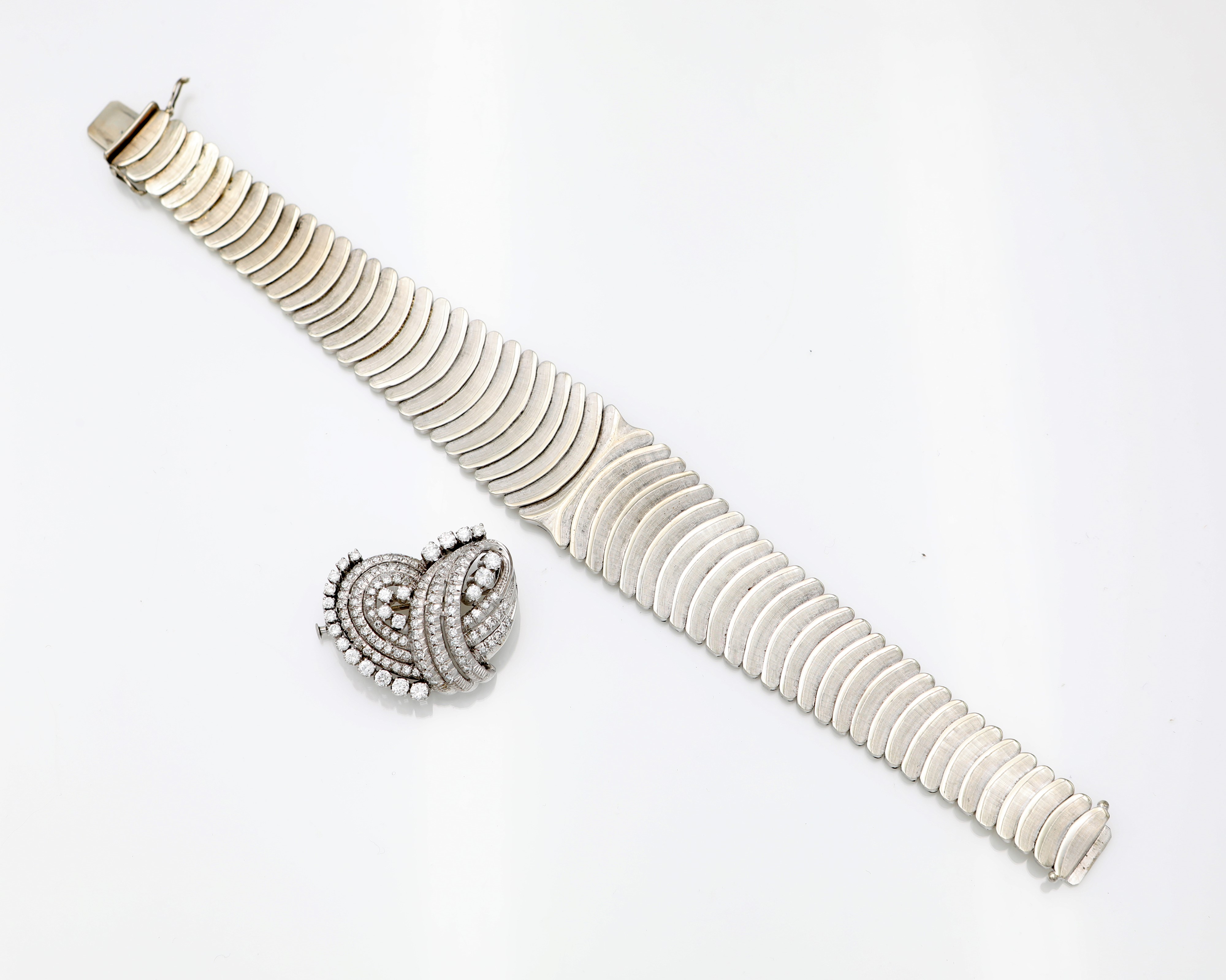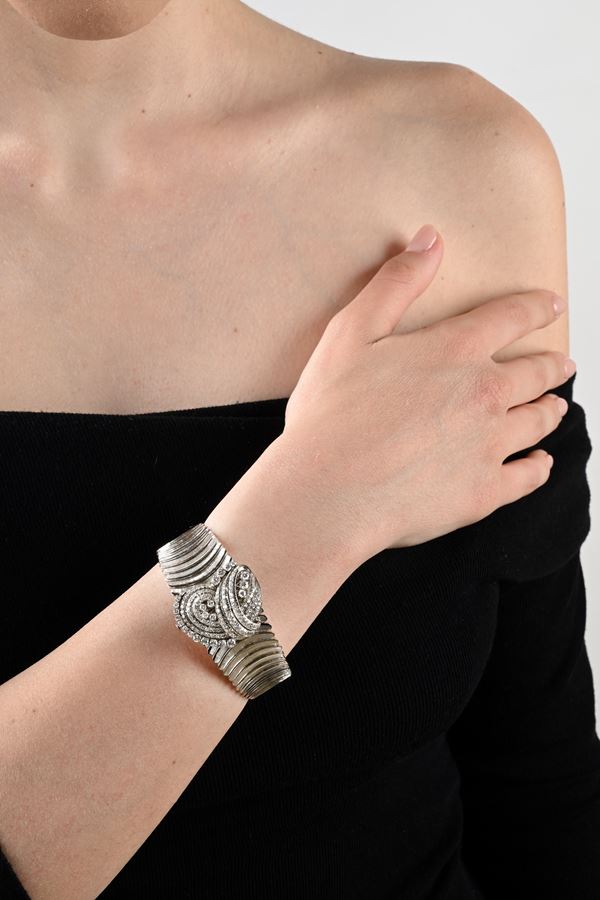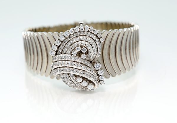 Oro bianco 750/000. Diamanti in taglio rotondo brillante ct. 3 ca. Peso complessivo gr. 81,10. Spilla centrale estraibile.