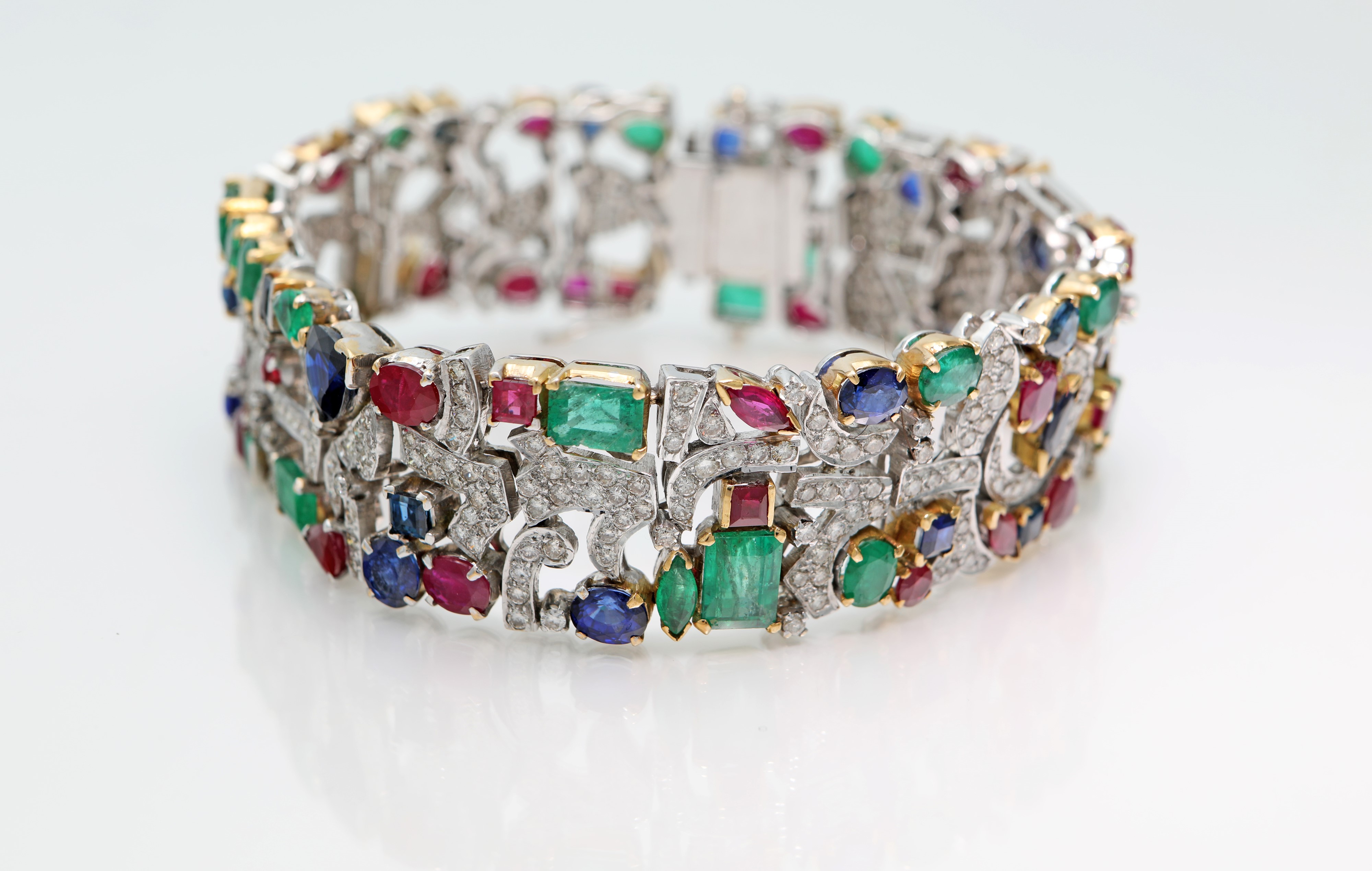 Oro giallo e bianco 750 mm. Smeraldi in taglio ovale, goccia e gradini ct. 11 ca., zaffiri in taglio ovale carrè e goccia ct. 5 ca., rubini in taglio navette ovale e carrè ct. 4,50 ca., diamanti in taglio rotondo brillante ct. 2,50ca. Peso complessivo gr. 55,10.