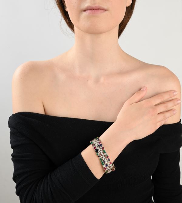Bracciale "Tutti frutti" in oro, zaffiri, rubini, smeraldi e brillanti