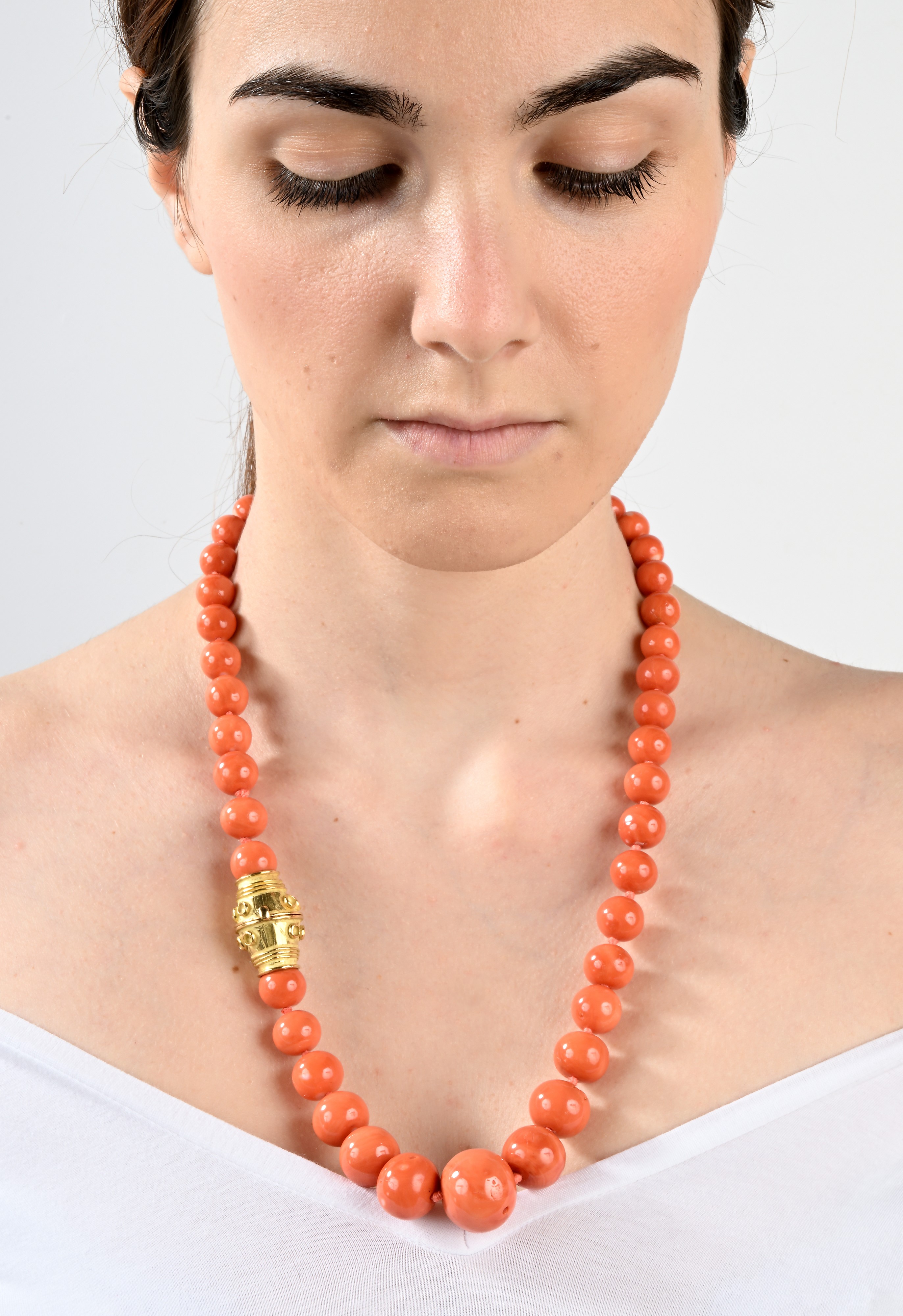 Oro giallo 750/000. Corallo in taglio sferico da mm. 10 a mm. 21. Peso complessivo gr. 127,60.