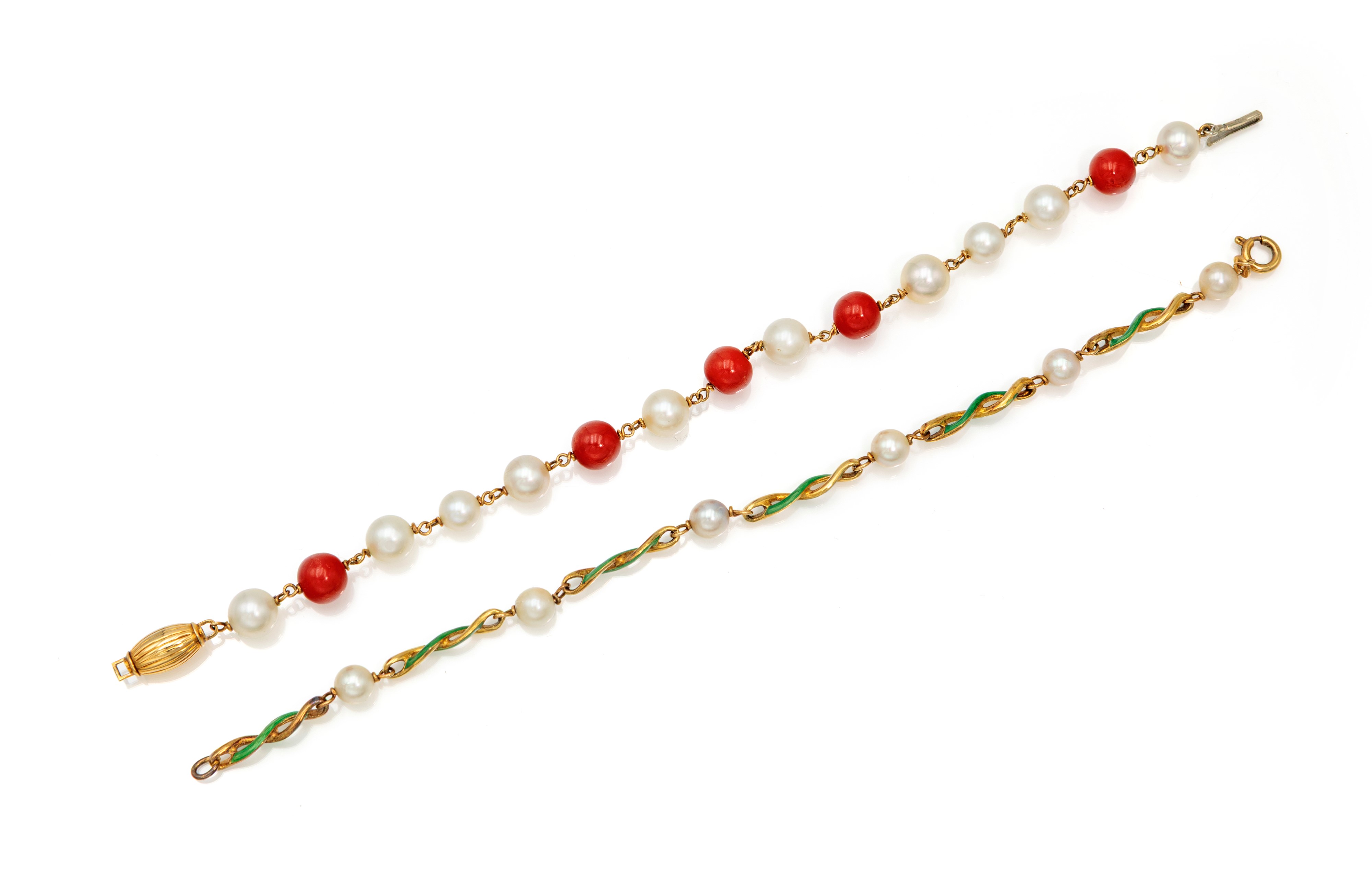 Coppia di bracciali in oro, perle, corallo e smalti