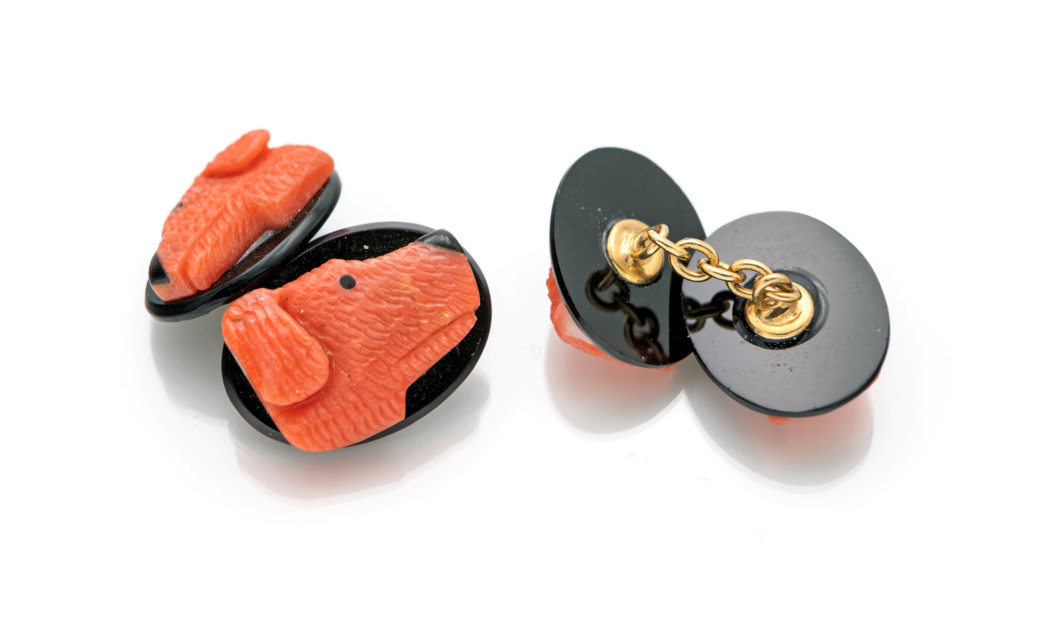 Coppia di gemelli a soggetto animalier in oro corallo e onice