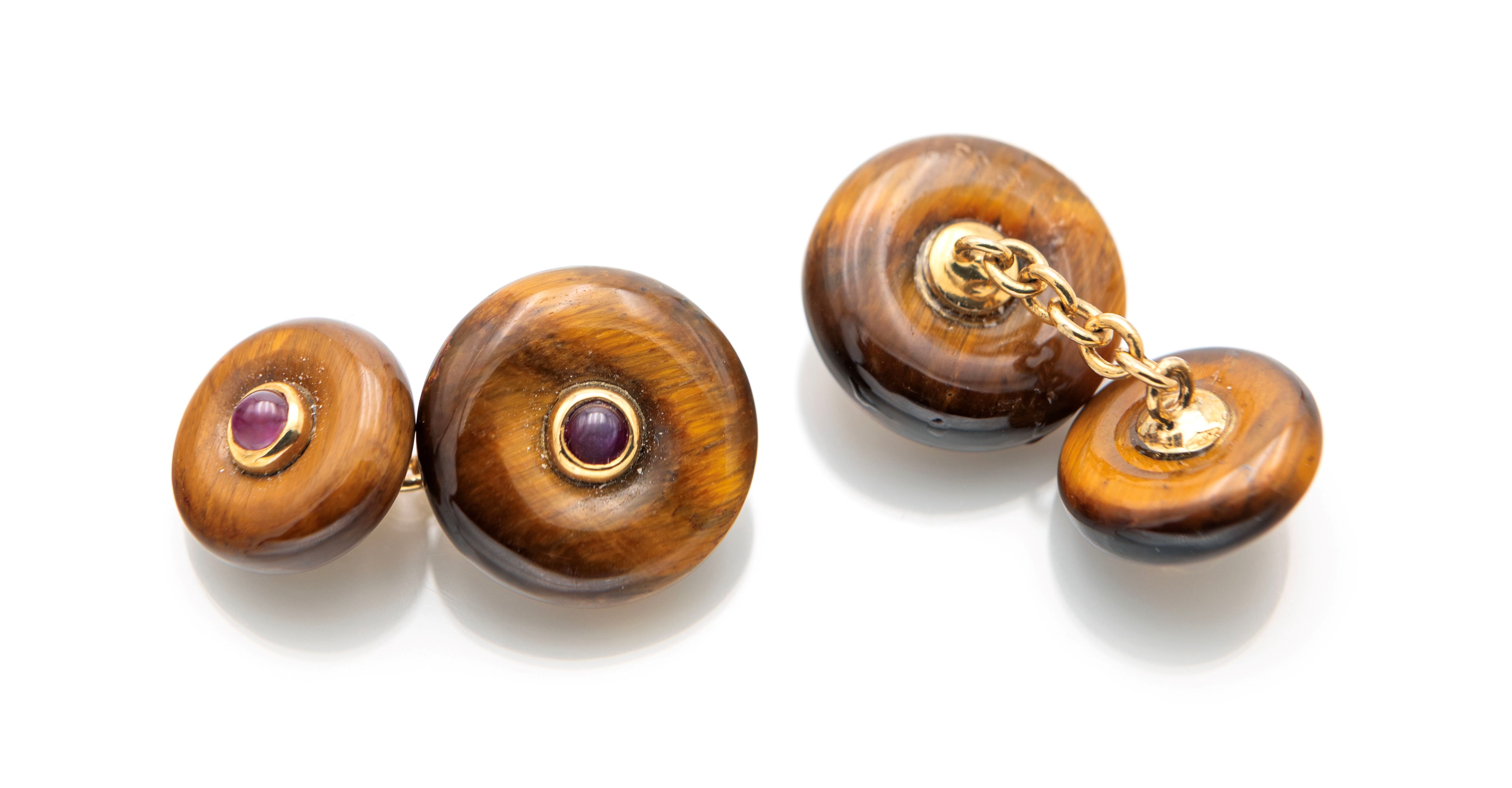 Coppia di gemelli in oro, occhio di tigre e rubini