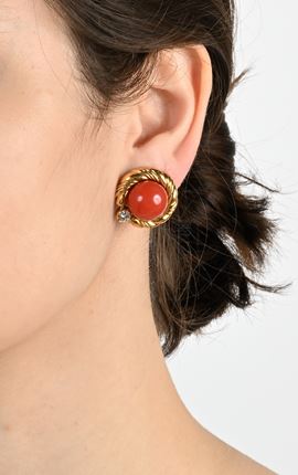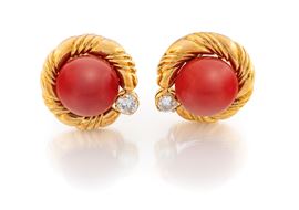 Coppia di orecchini a lobo in oro, corallo e brillante