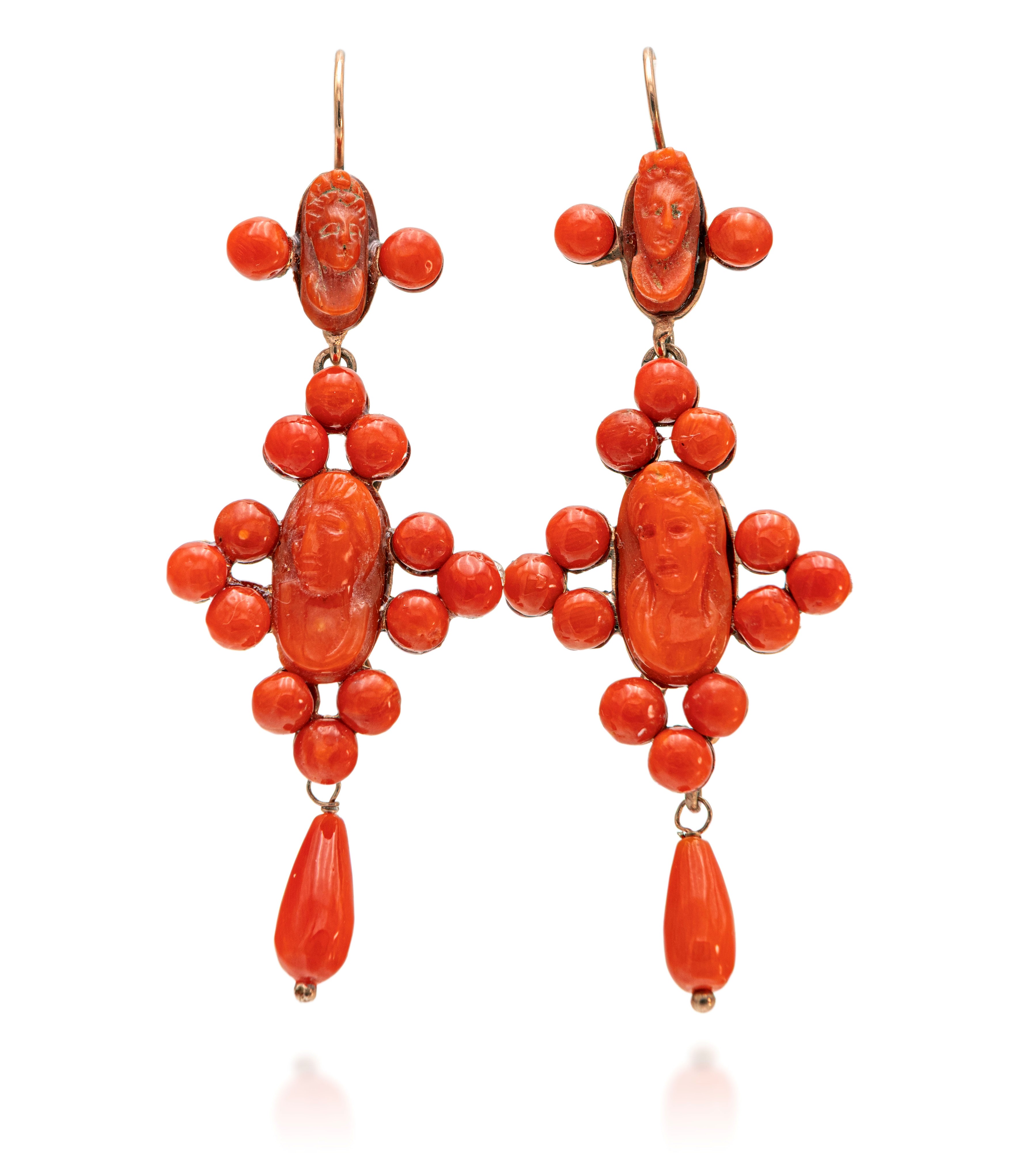 Oro a basso titolo, argento. Corallo mediterraneo. Peso complessivo gr. 11,90.