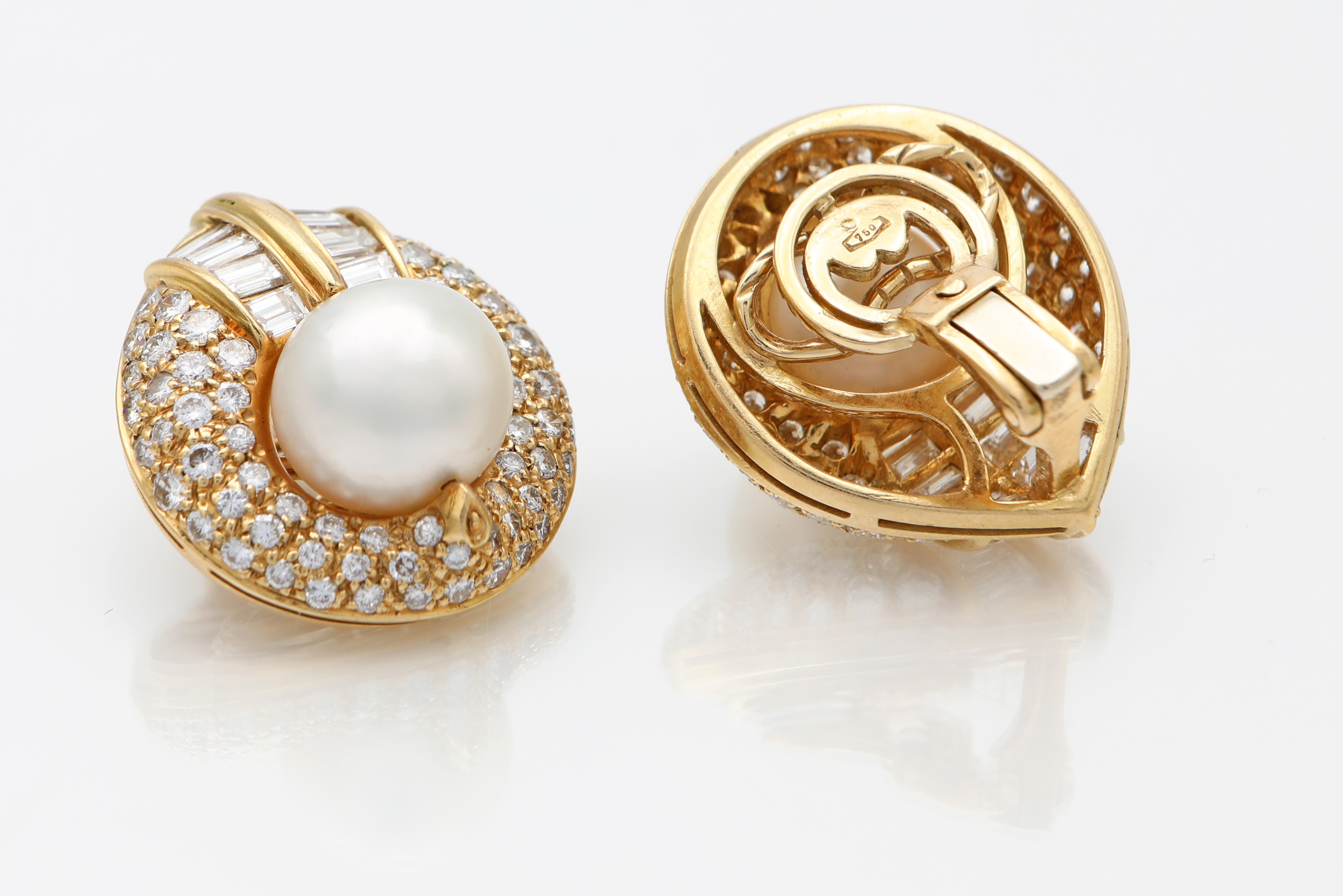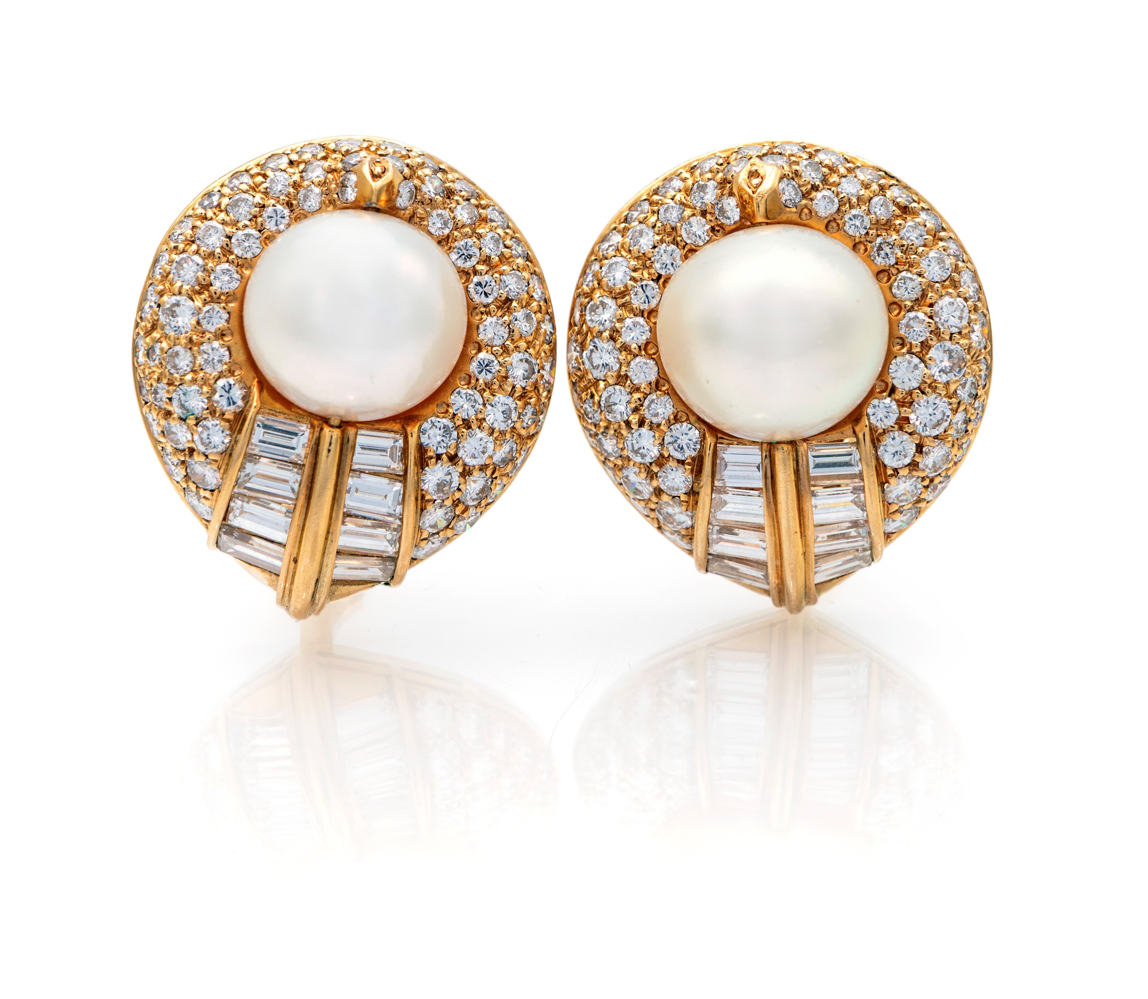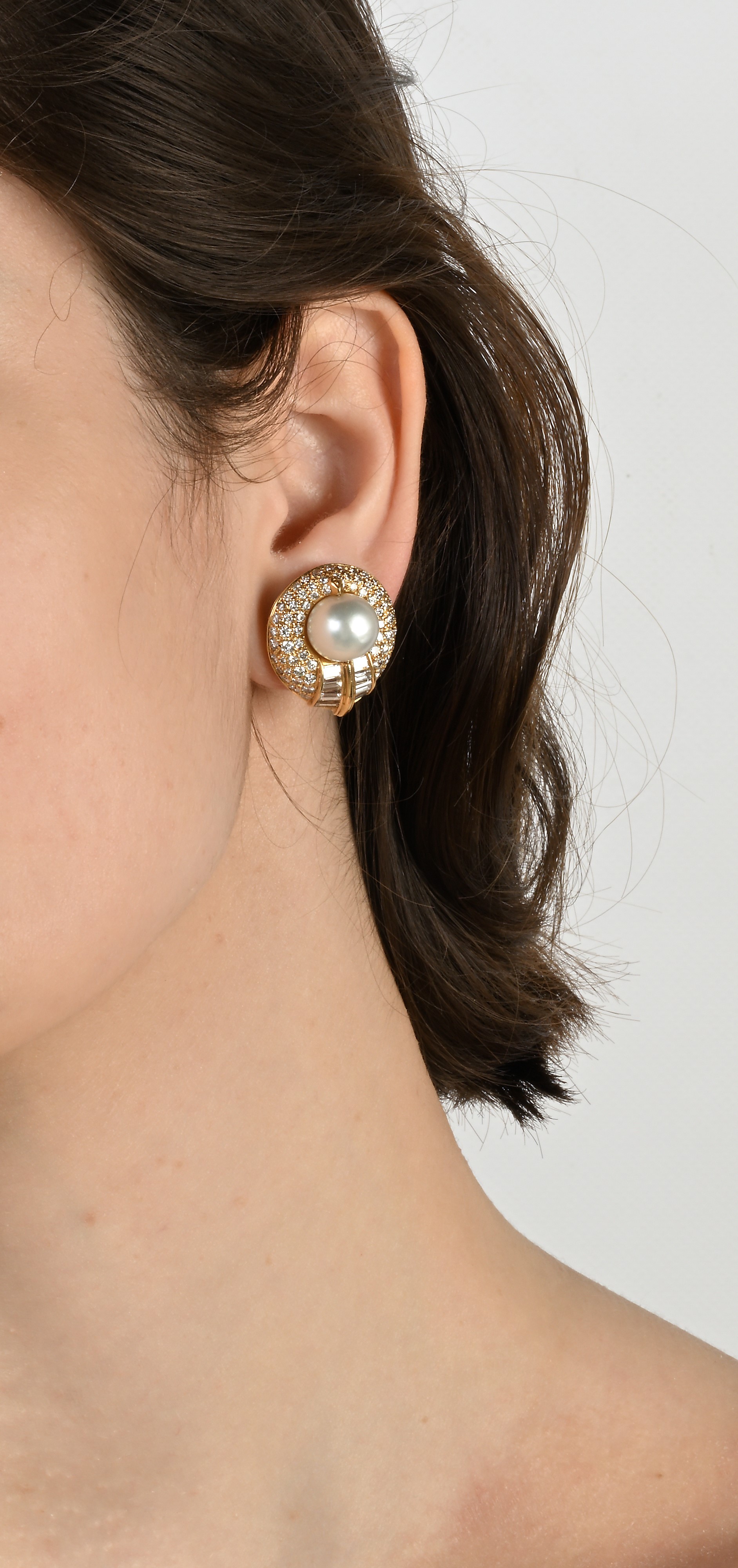 Oro giallo 750 mm. Diamanti in taglio baguettes carati 3,80. Perle SOUTHSEE mm. 11