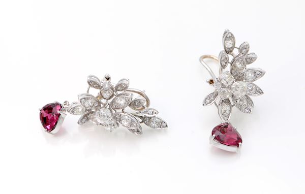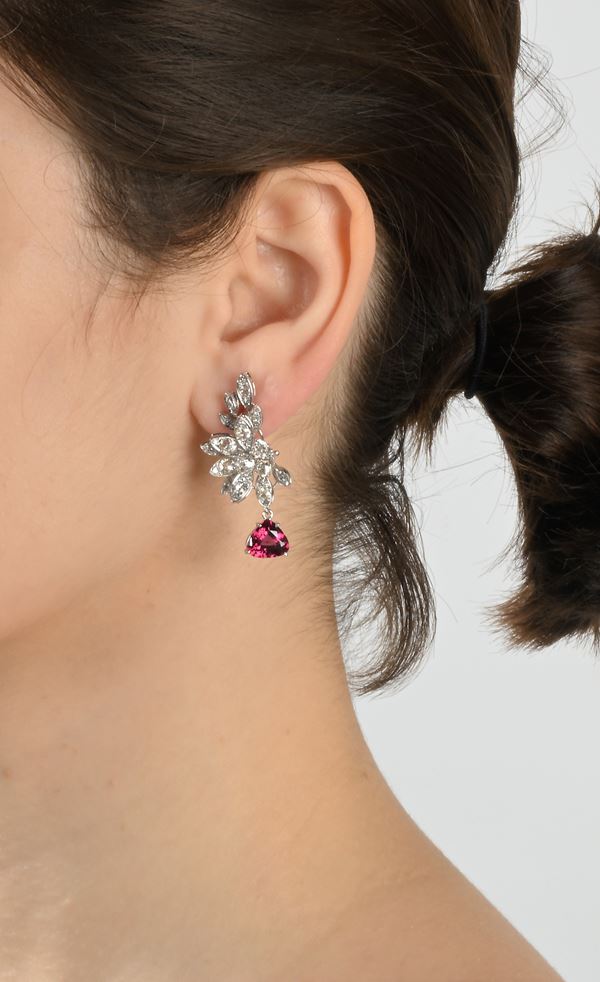 Coppia di orecchini in oro, brillanti e rubelliti