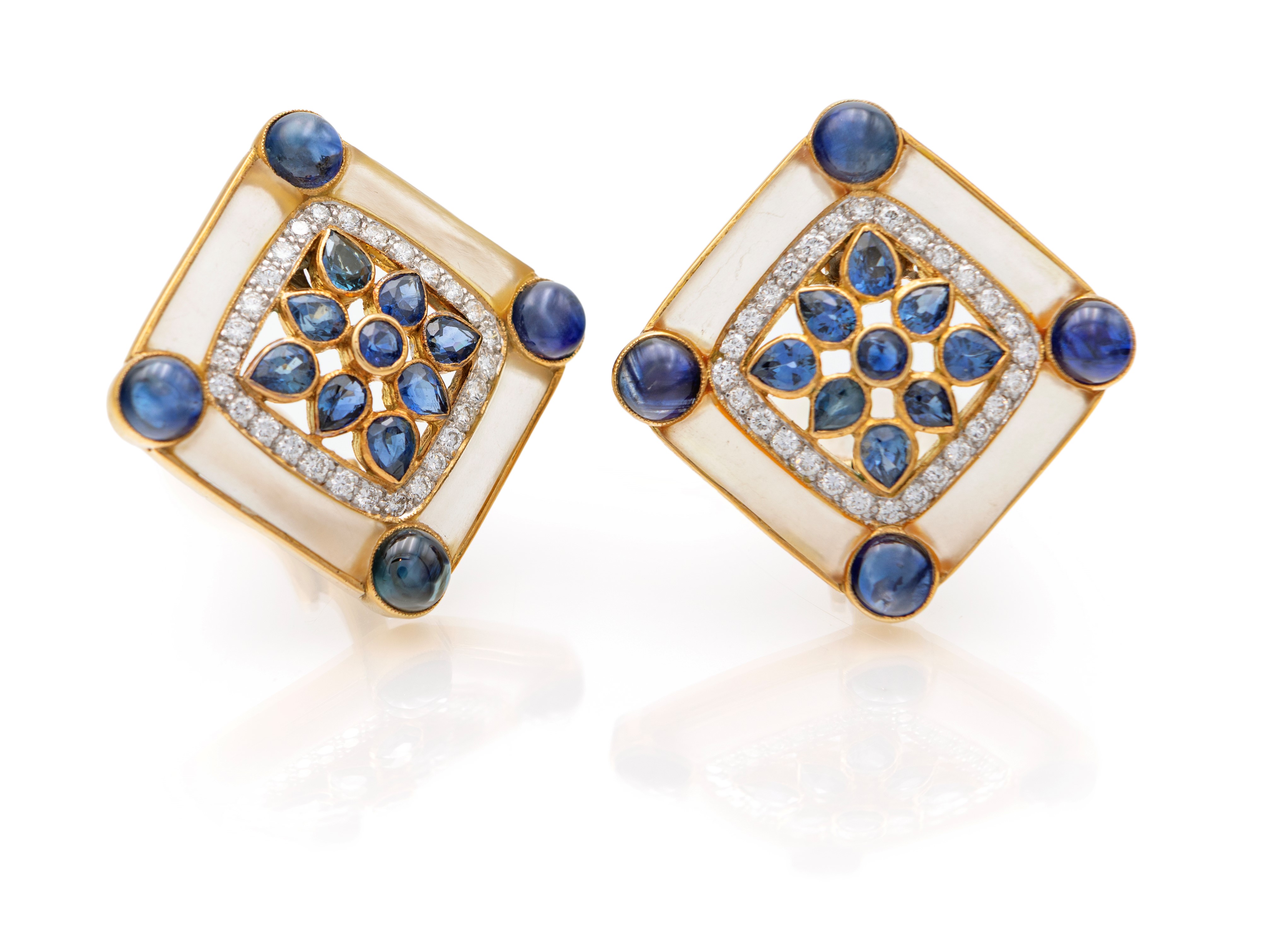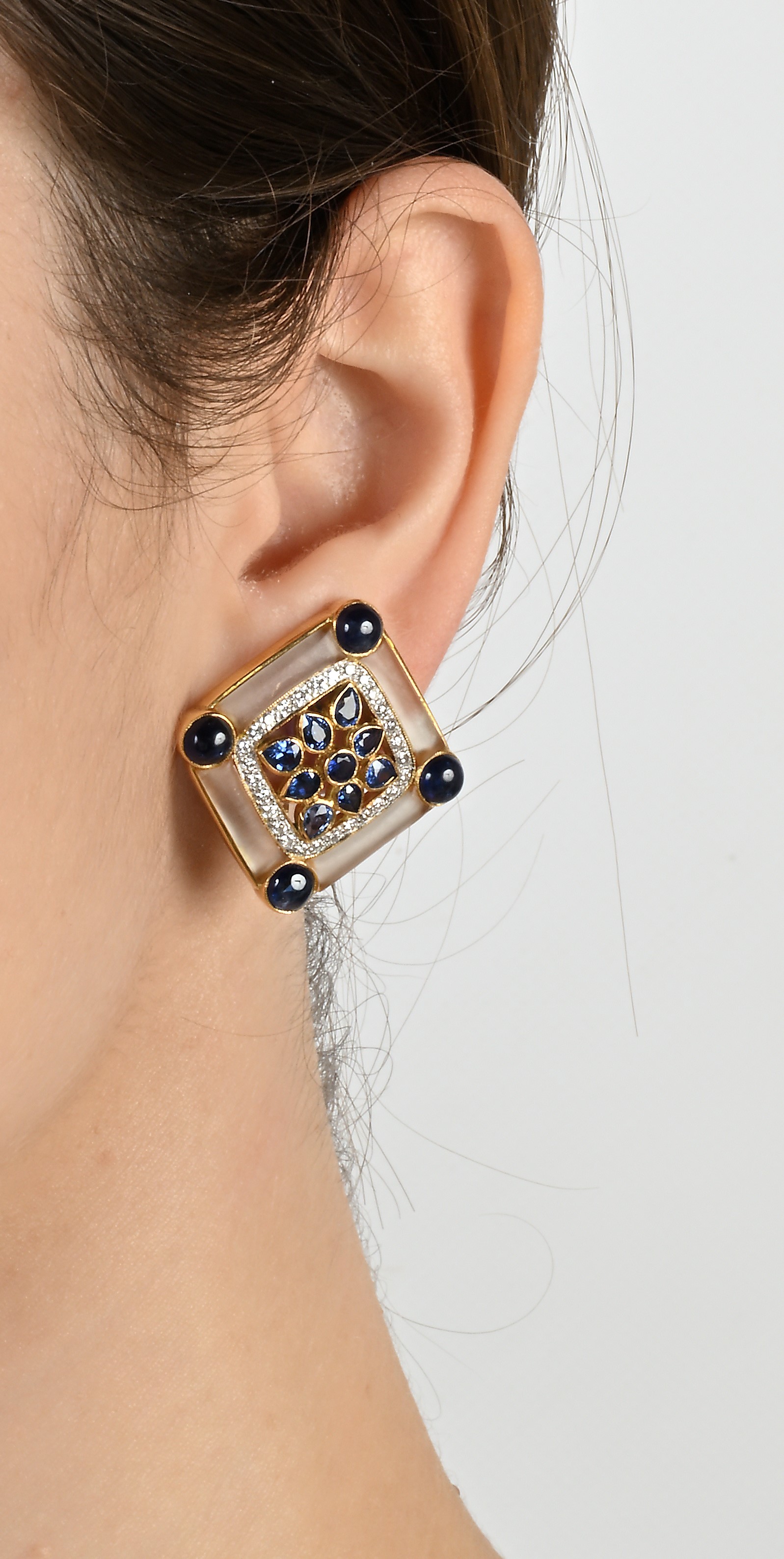 Coppia di orecchini in oro, brillanti, zaffiri e cristallo di rocca