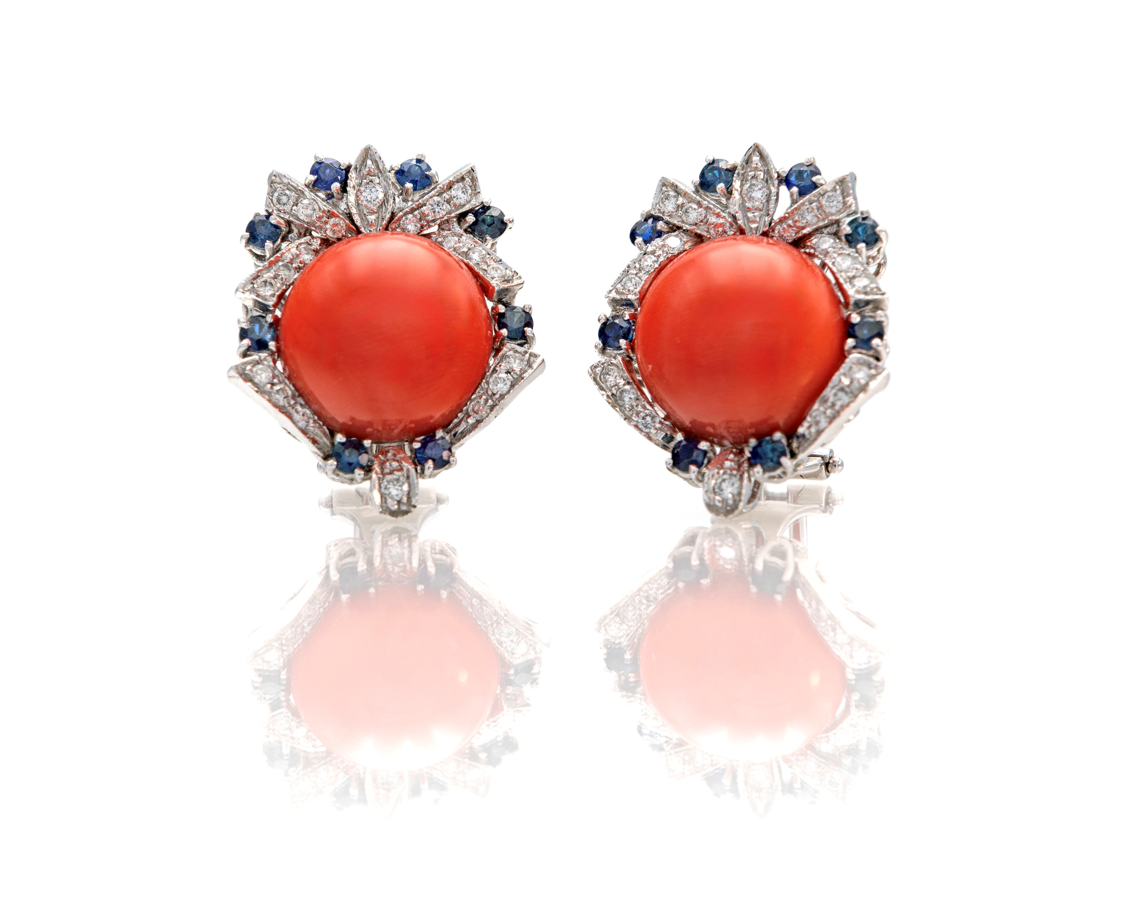 Coppia di orecchini in oro, corallo, diamanti e zaffiri