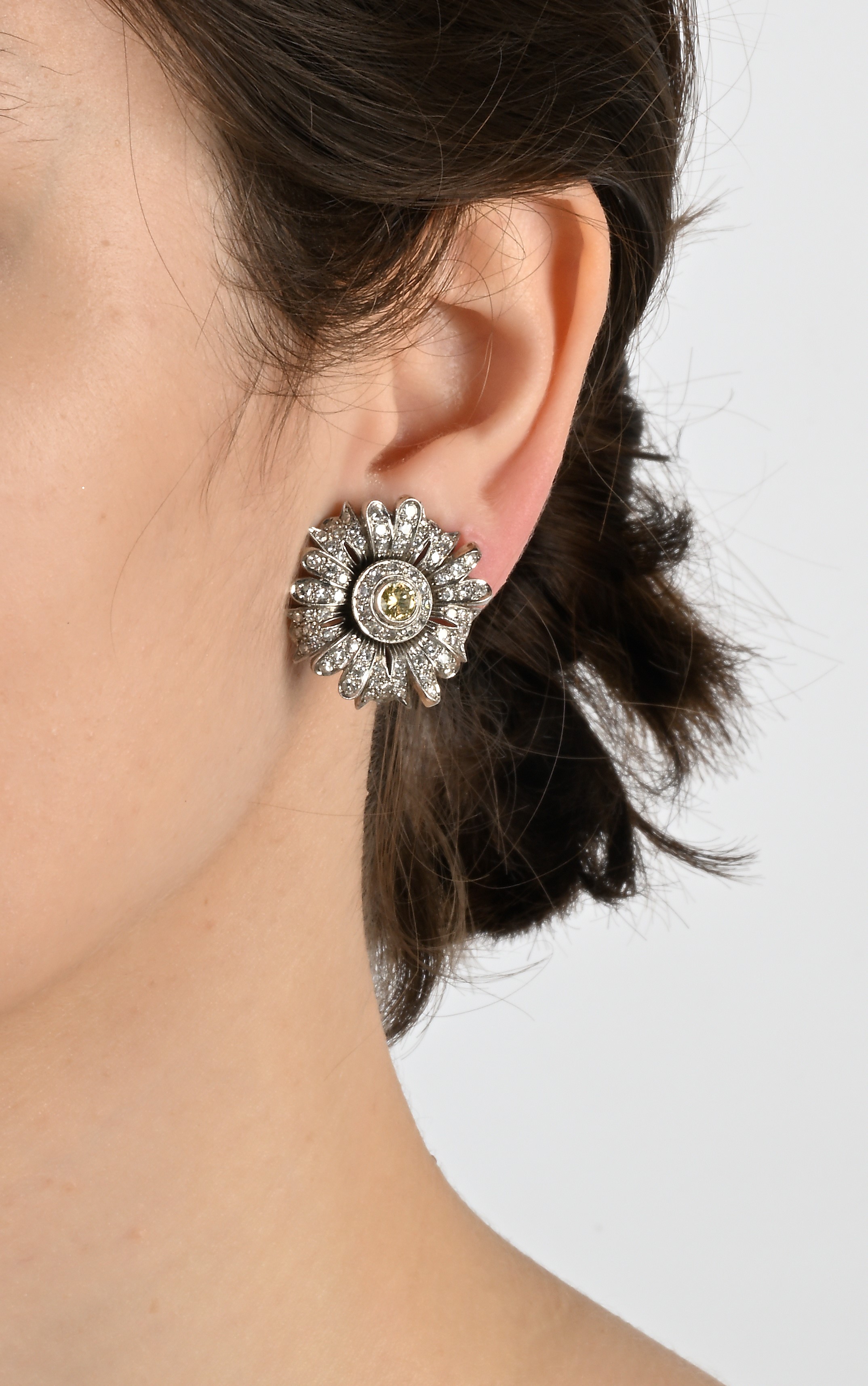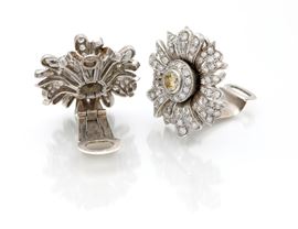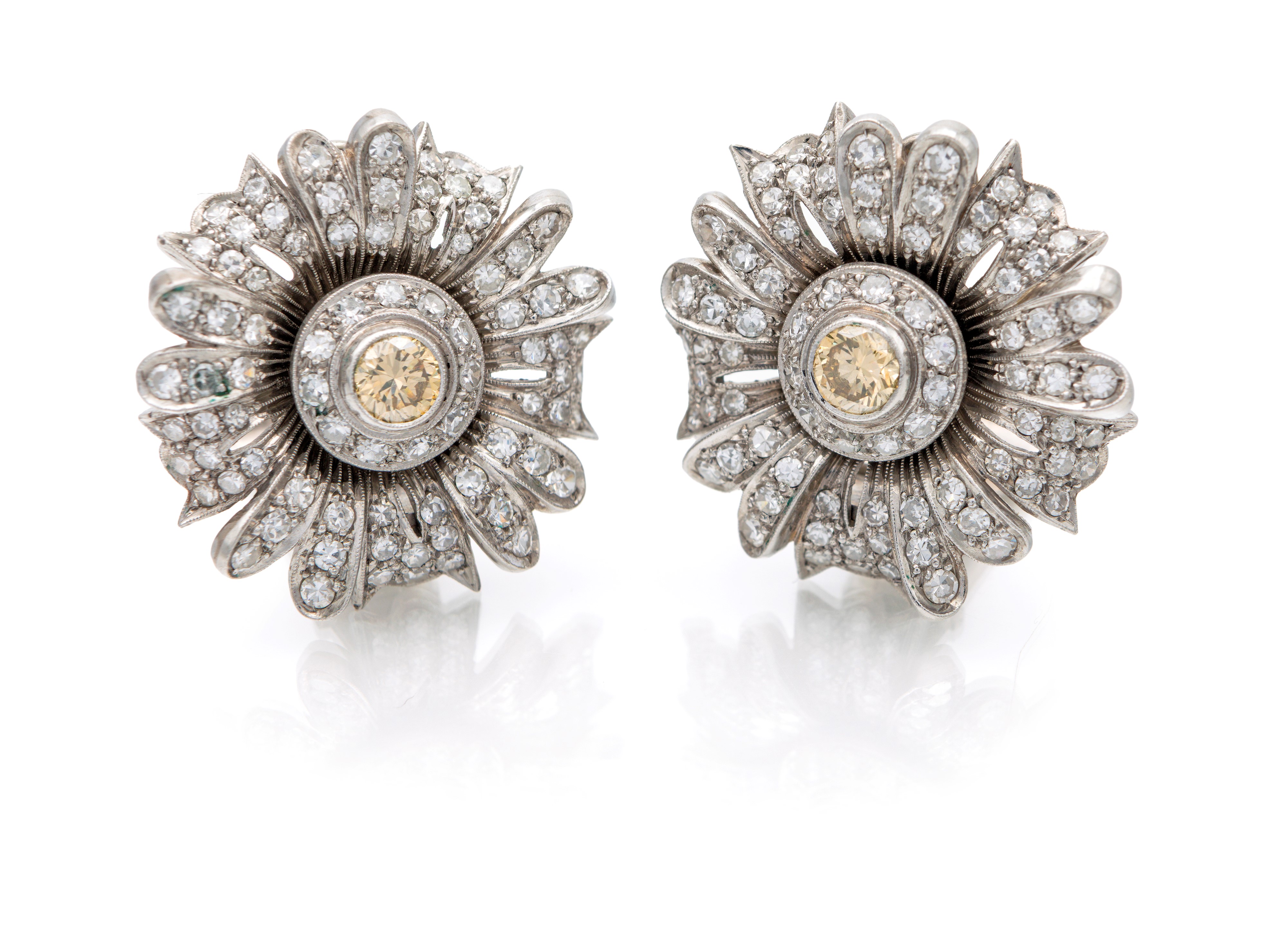 Oro bianco 750/1000. Diamanti in taglio rotondo ct. 4 ca, diamanti solitario centrali fancy colore ct. 0,80 ca.