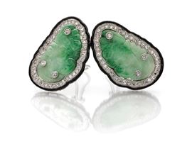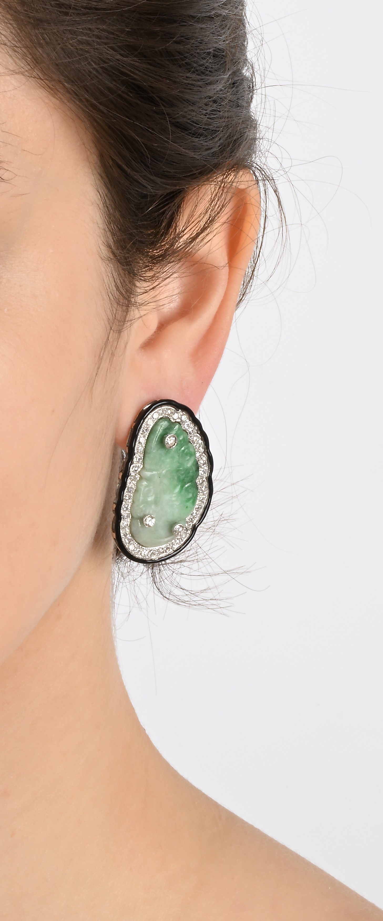 Coppia di orecchini in oro, giade, smalto e brillanti