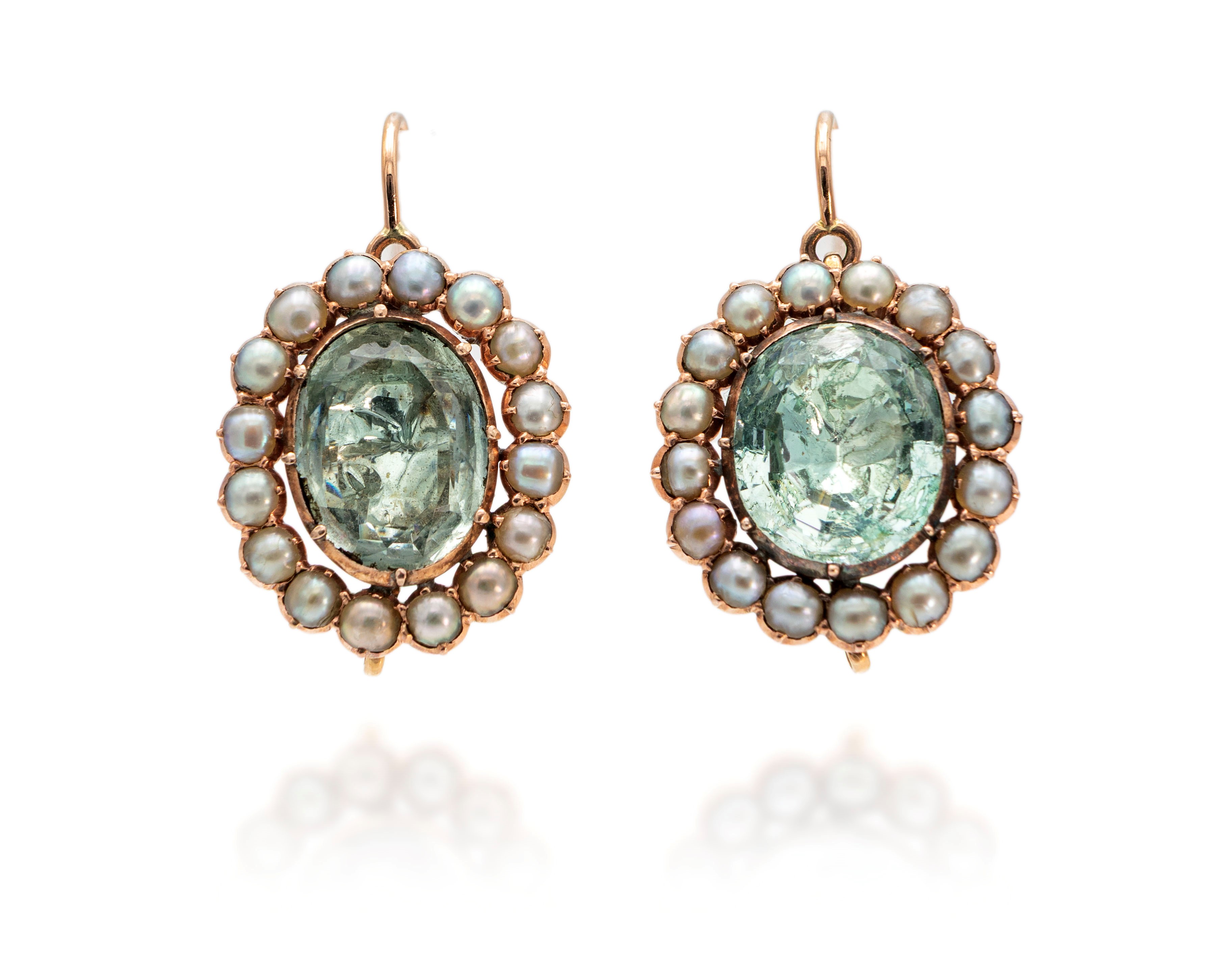Coppia di orecchini pendenti in oro, acquamarine e microperle