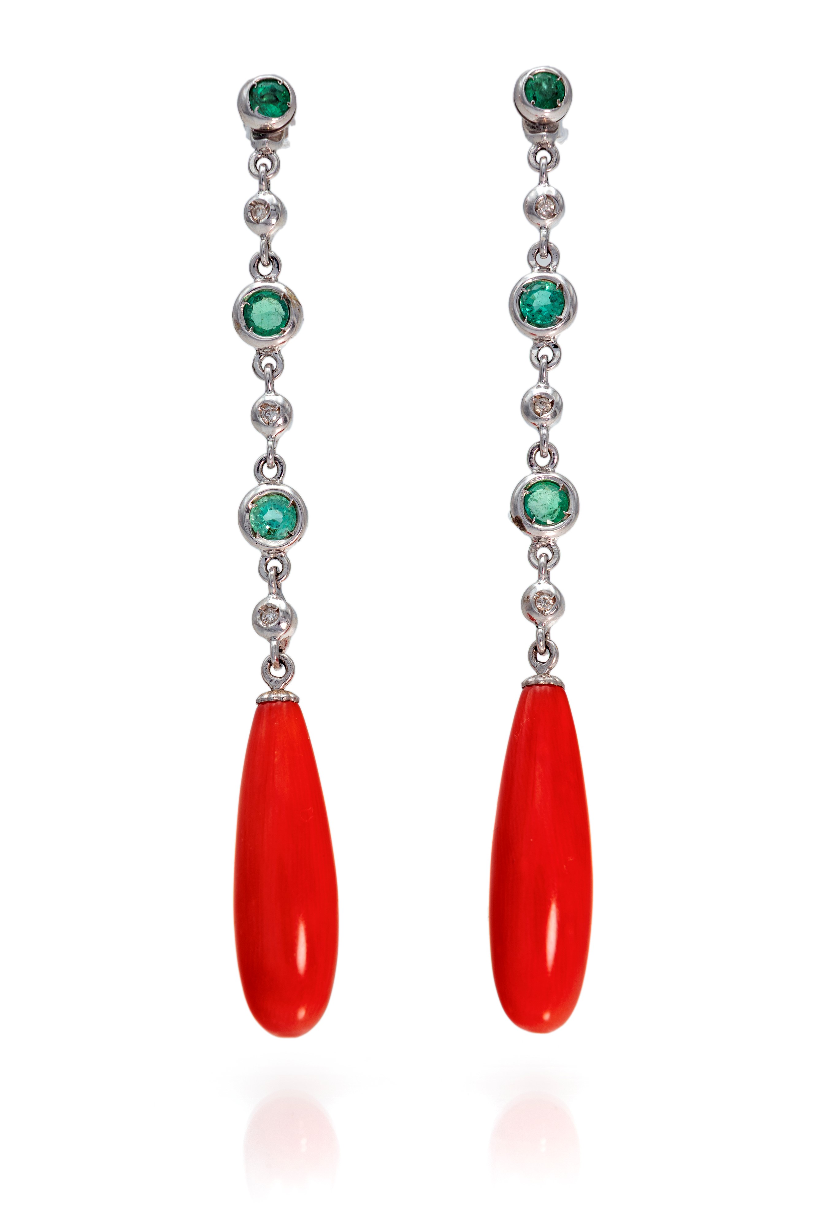 Coppia di orecchini pendenti in oro, corallo, smeraldi e brillanti