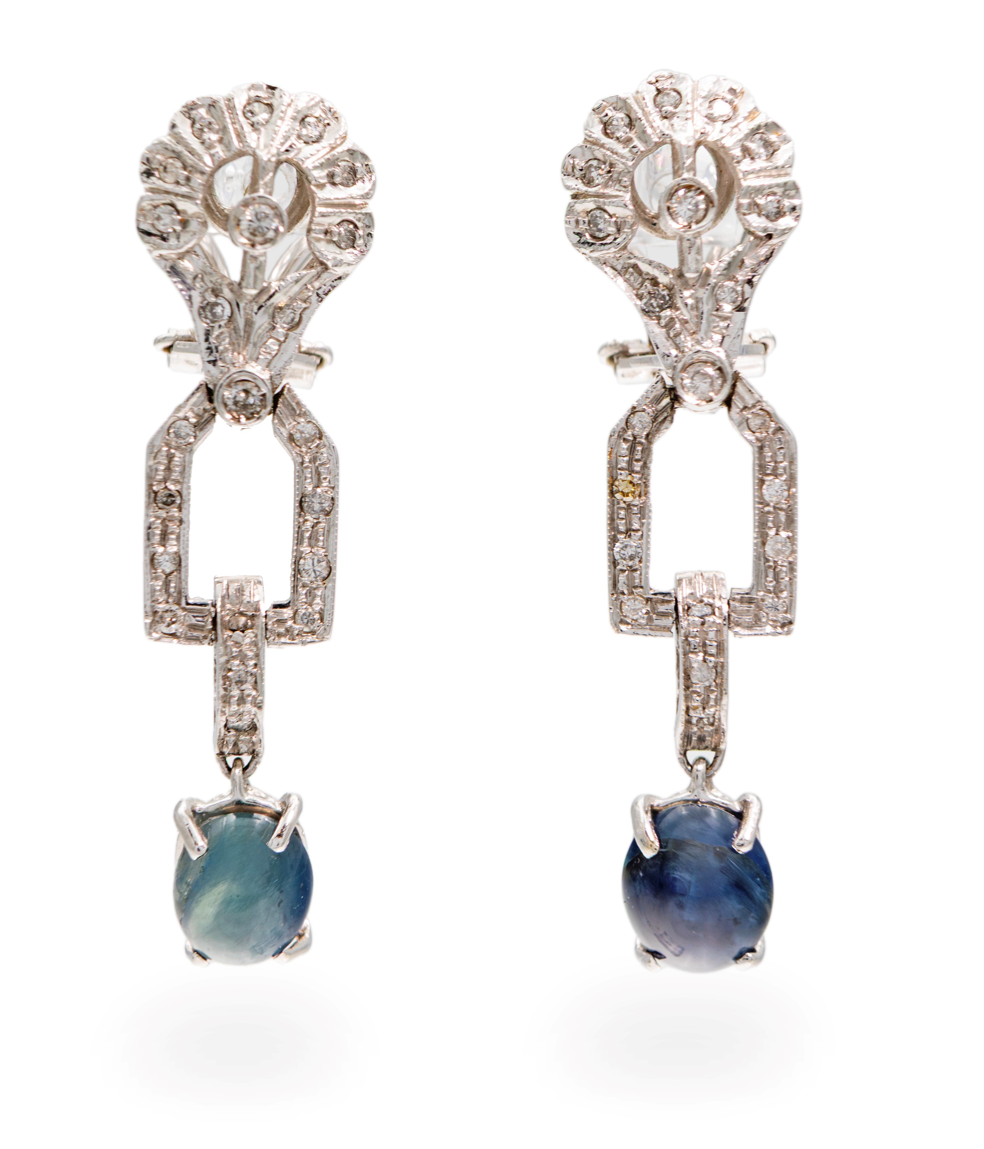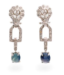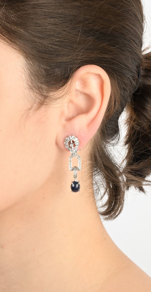 Coppia di orecchini pendenti in oro, diamanti e zaffiri