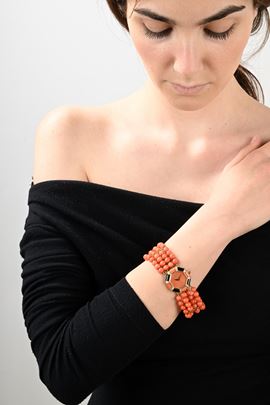 Oro giallo 750/000. Corallo rosso in taglio sferico mm. 6. Diamanti in taglio rotondo brillante. Peso complessivo gr. 58,60.