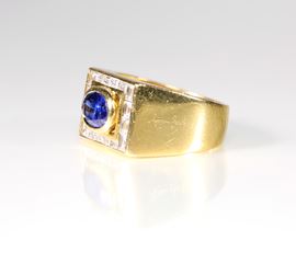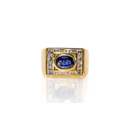 Oro giallo 750/000. Zaffiro in taglio ovale, diamanti in taglio baguettes ct. 0,80 ca. Peso complessivo gr. 7,90