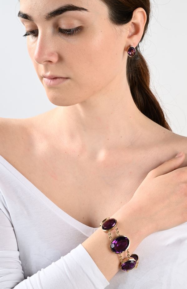 Parure di bracciale e coppia di orecchini in oro e ametiste