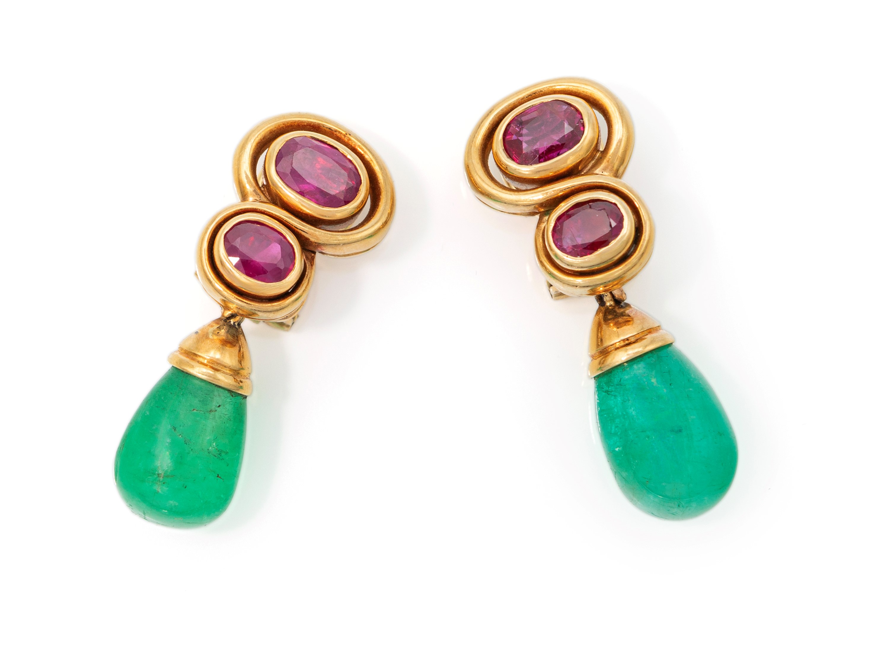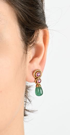 Petochi, coppia di orecchini pendenti in oro, smeraldi e rubini