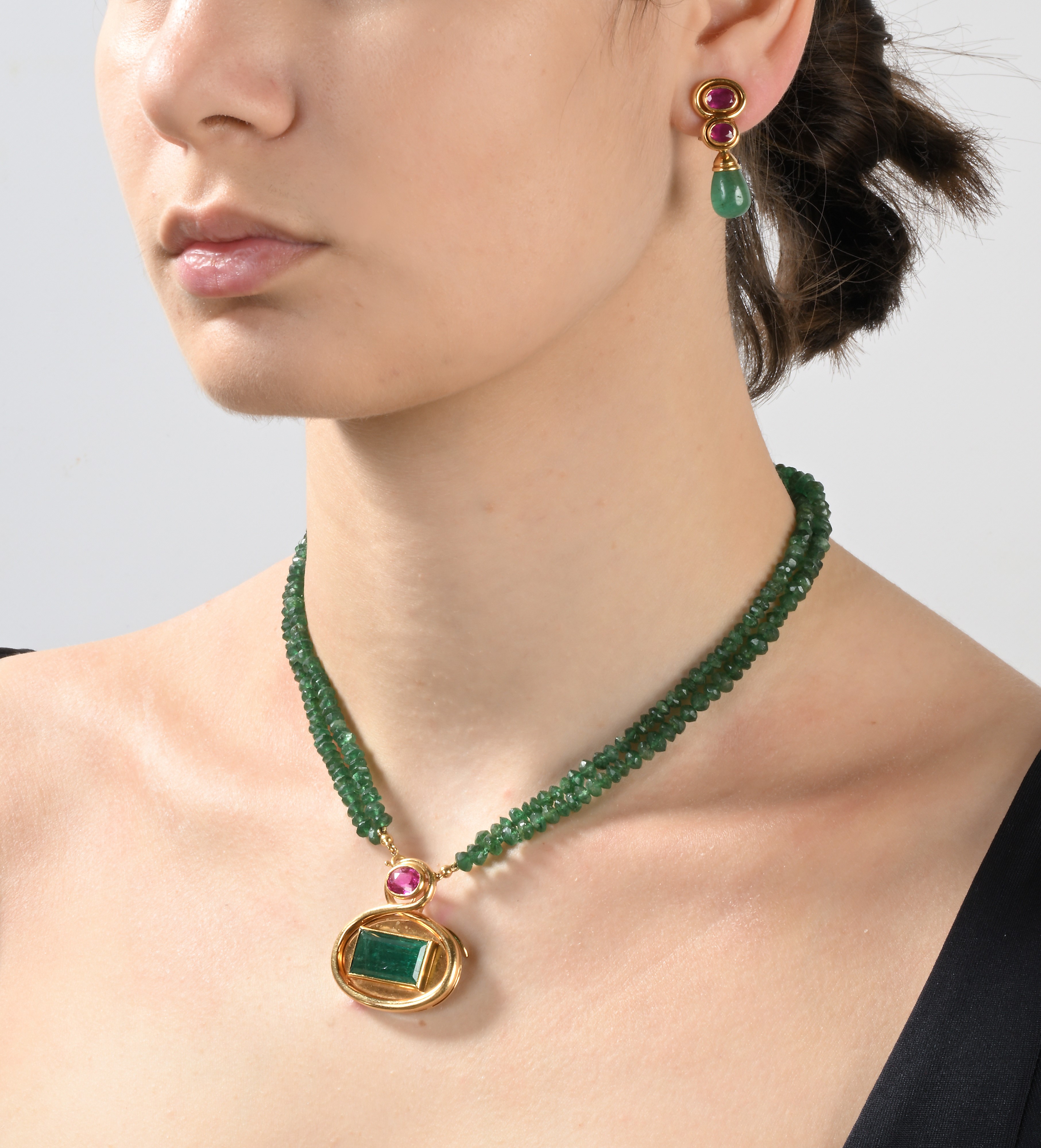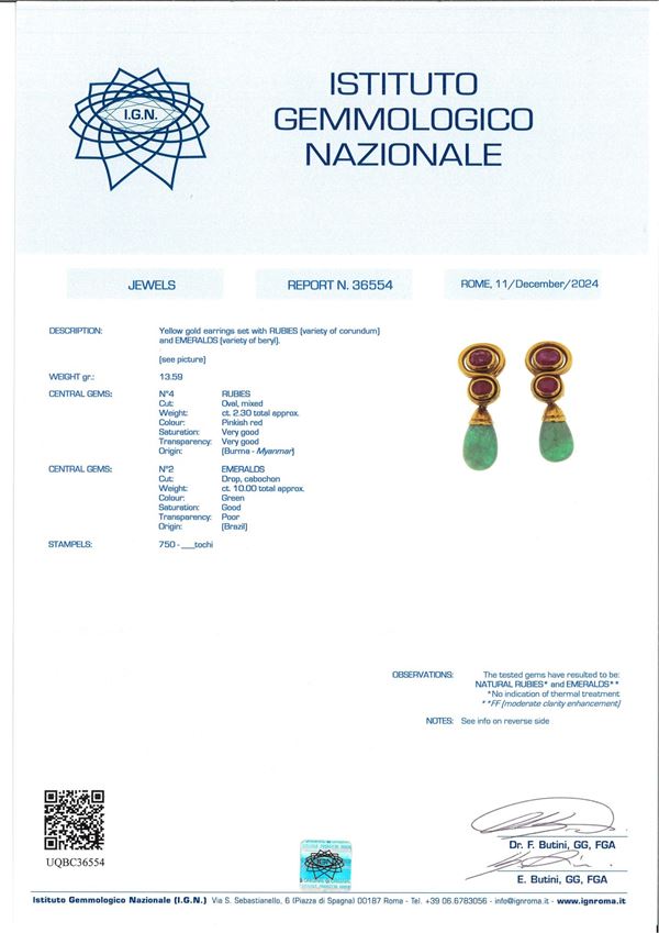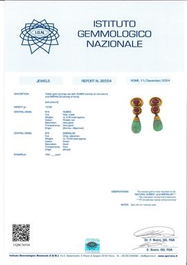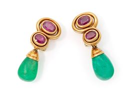 Oro giallo 750/000. Rubini in taglio ovale ct. 2,30, BURMA - MYANMAR, SENZA INDICAZIONE DI TRATTAMENTO TERMICO. Smeraldi in taglio goccia cabochon ct. 10 ca. Peso complessivo gr. 13,60. Corredati di certificazione gemmologica IGN n° 36554 del 11/12/24