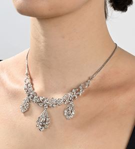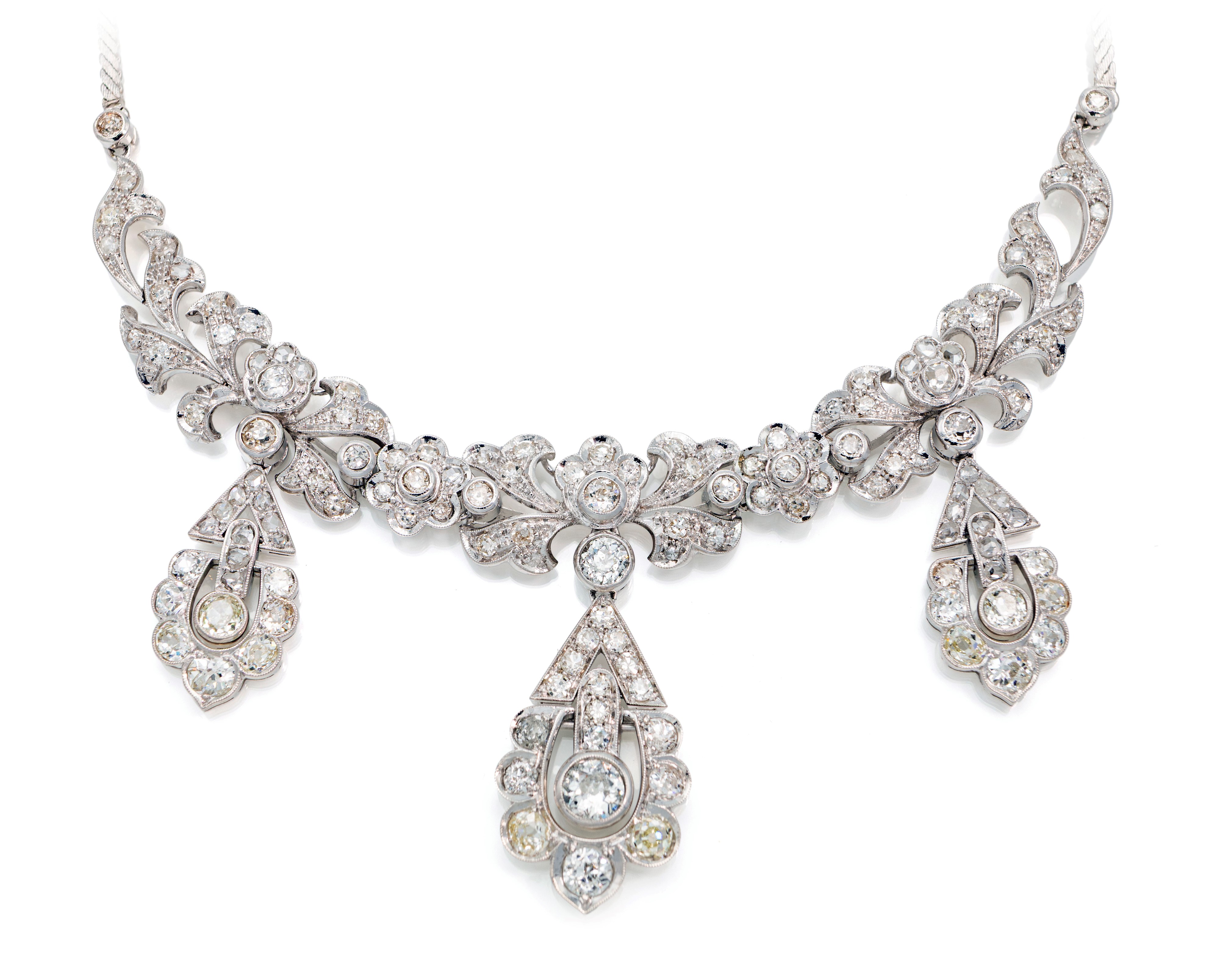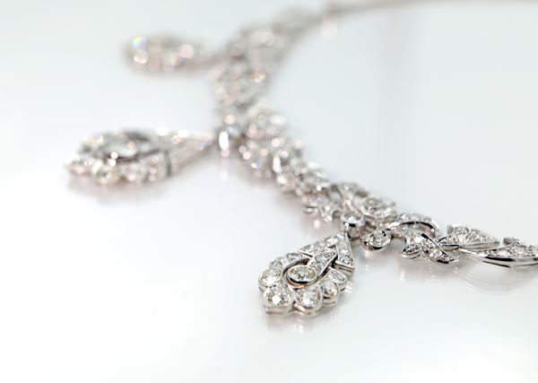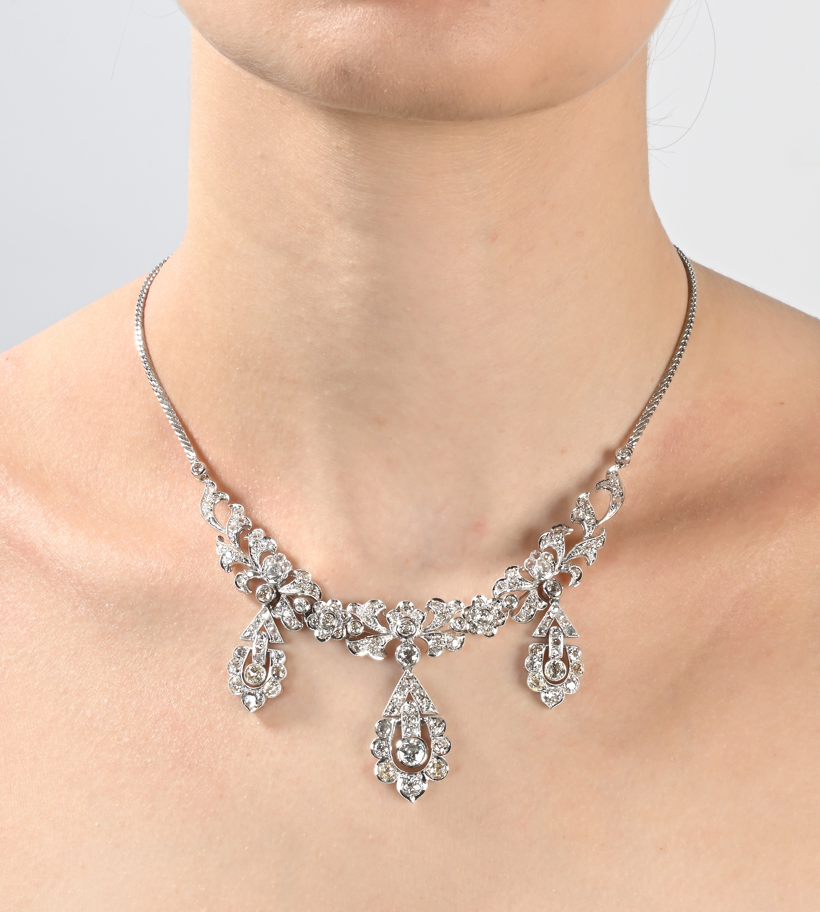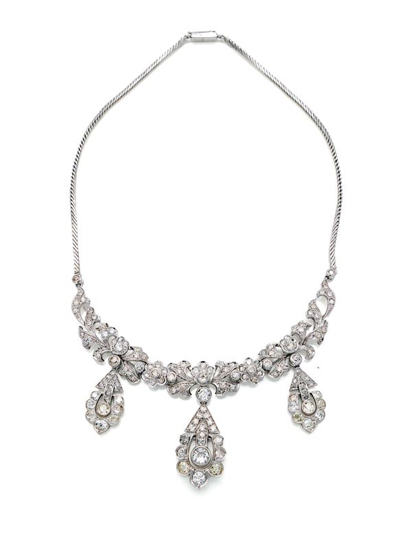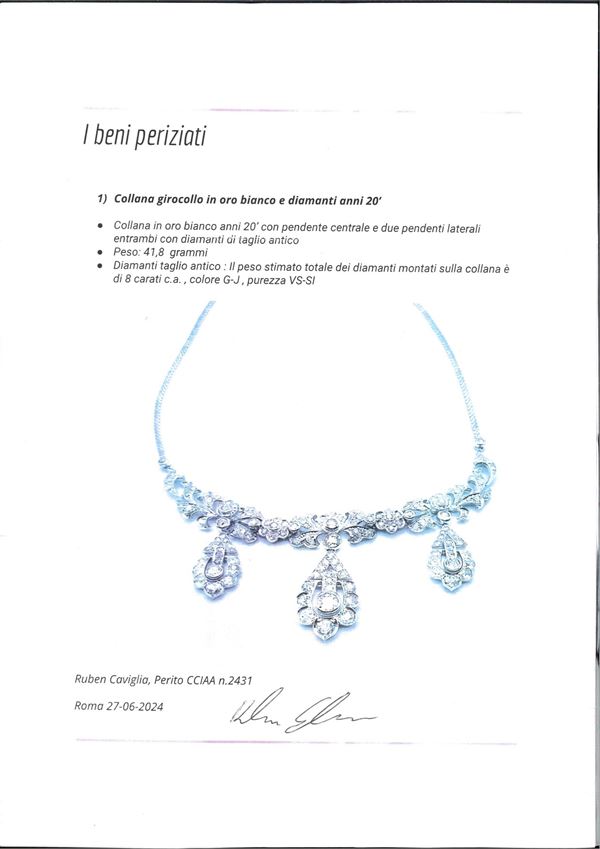 Oro bianco 750/000. Diamanti in taglio antico ct. 8, colore G-J, purezza VS-SI. Peso complessivo 41,80.