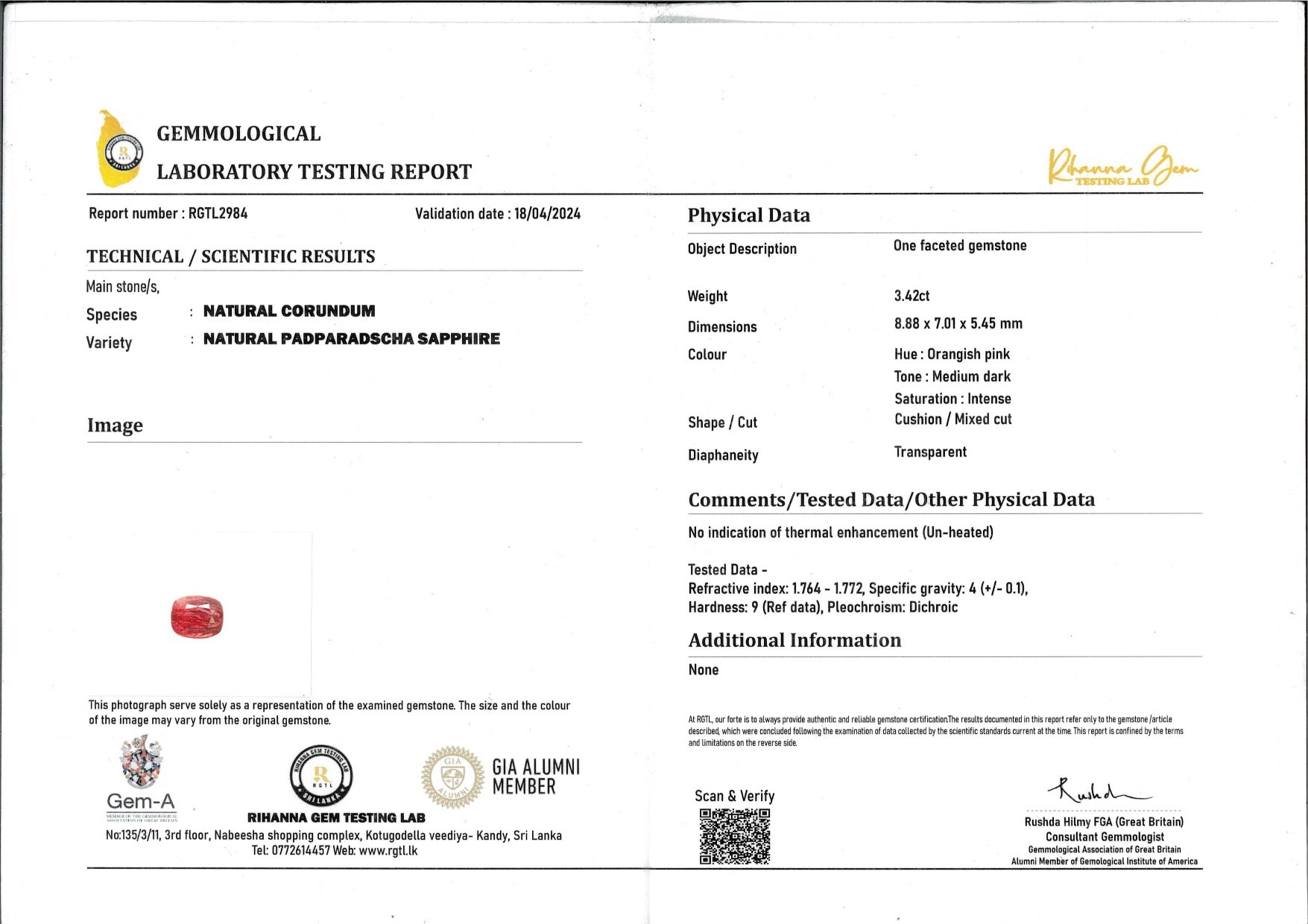 Corredato di certificazione gemmologica Gemstone Report n° RGTL2984. Zaffiro in taglio cuscino, SENZA INDICAZIONE DI TRATTAMENTO TERMICO, orangish pink, saturazione intensa, trasparente.