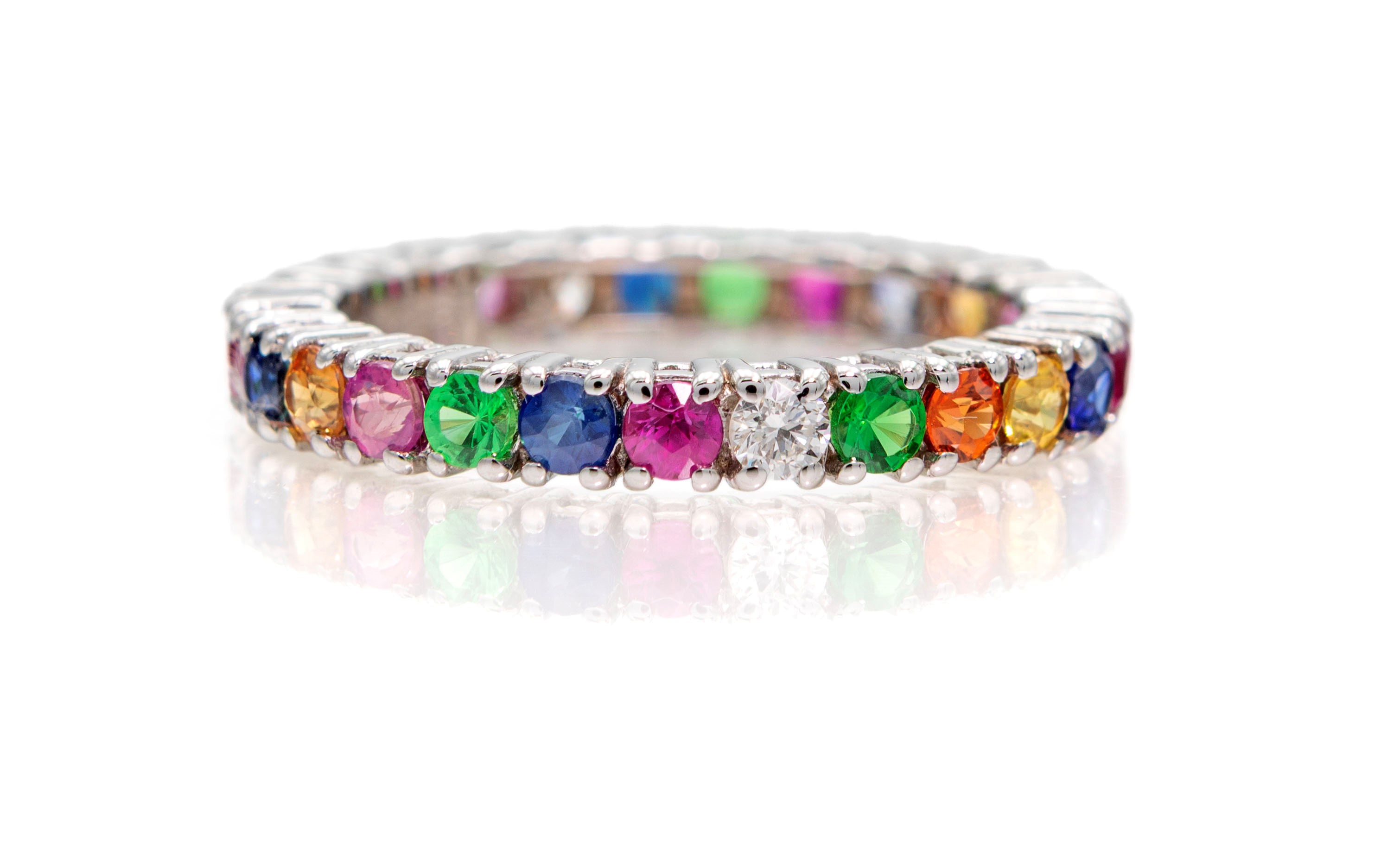 Oro bianco 750/000. Zaffiri blu, rosa, verdi, gialli e diamanti ct. 1 ca. Peso complessivo gr. 2,90
